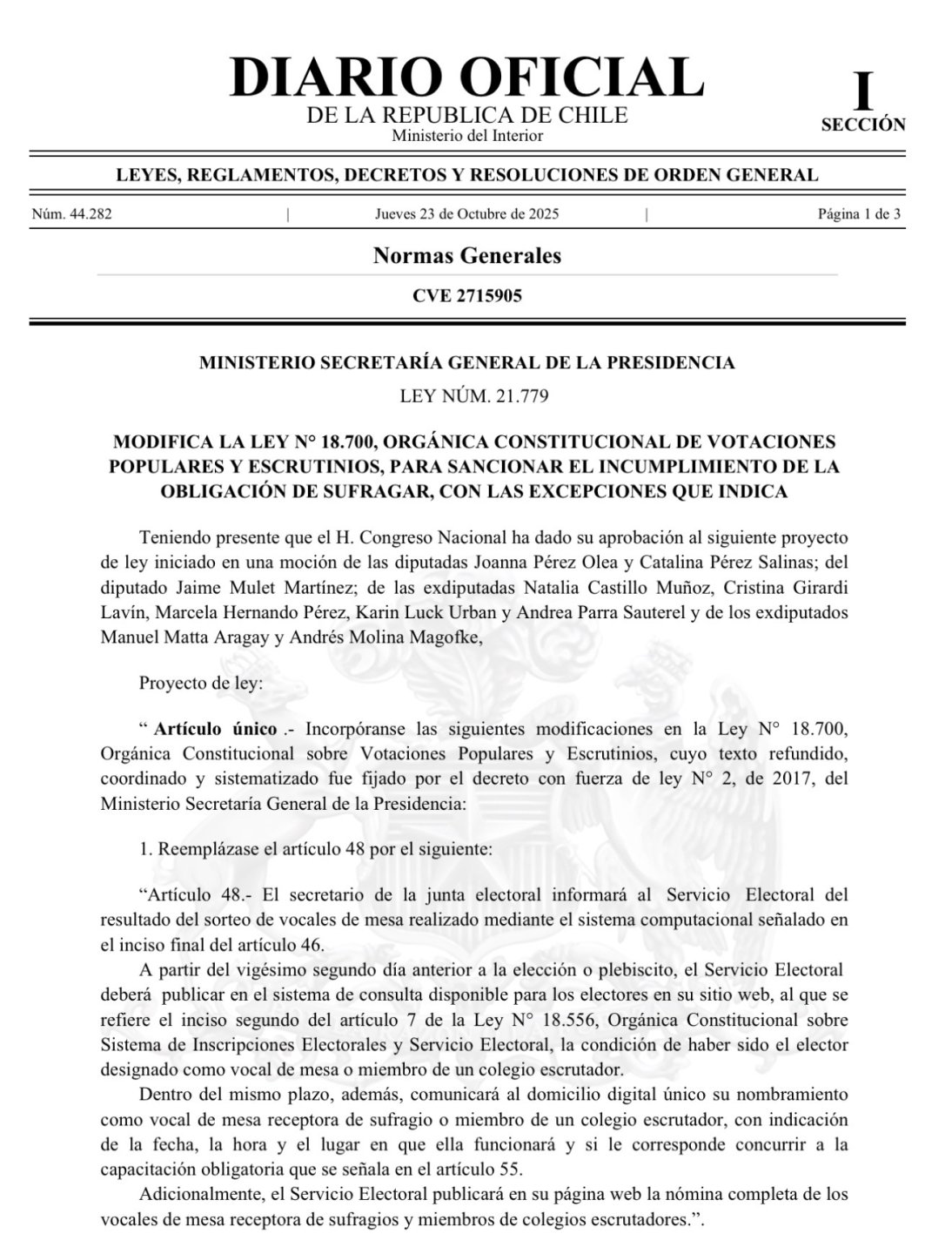 Luego de varios días de incertidumbre respecto de la falta del último paso –a cargo del Ministerio Secretaría General de la Presidencia (Segpres)– finalmente este jueves 23 de octubre el Diario Oficial publicó la modificación a la Ley N° 18.700, Orgánica Constitucional de Votaciones Populares y Escrutinios, nueva normativa que no solo sanciona el incumplimiento de la obligación de sufragar, sino que también elimina la obligación del Servicio Electoral (Servel) de publicar en diarios de circulación local o regional –los denominados diarios de papel– los listados de vocales de mesa para el proceso de elecciones que vivirá nuestro país durante el próximo mes de noviembre.