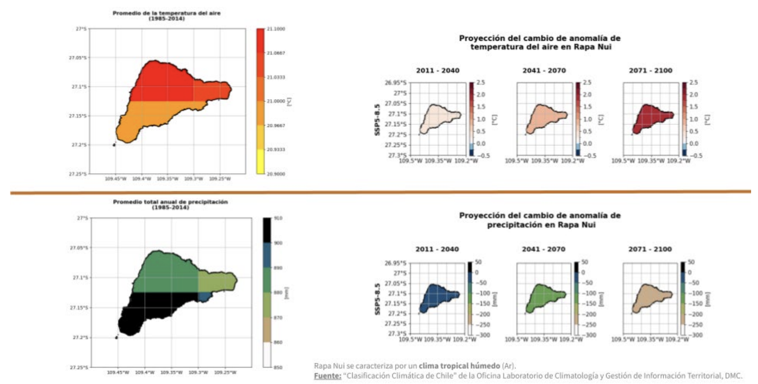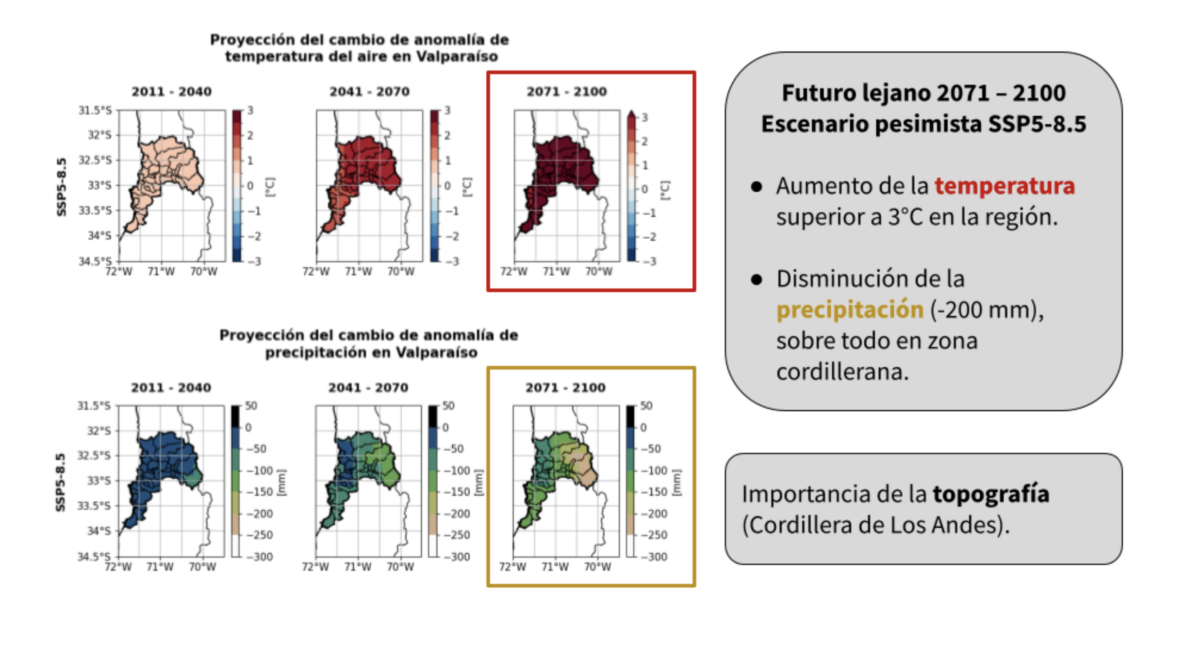 Entre los principales resultados, se anticipa un aumento de la temperatura superior a los 2,5 °C, junto con una disminución significativa de las precipitaciones, que podría alcanzar hasta 200 milímetros en sectores cordilleranos y también en Rapa Nui, y cerca de 100 milímetros en zonas del valle, la costa y el archipiélago Juan Fernández.