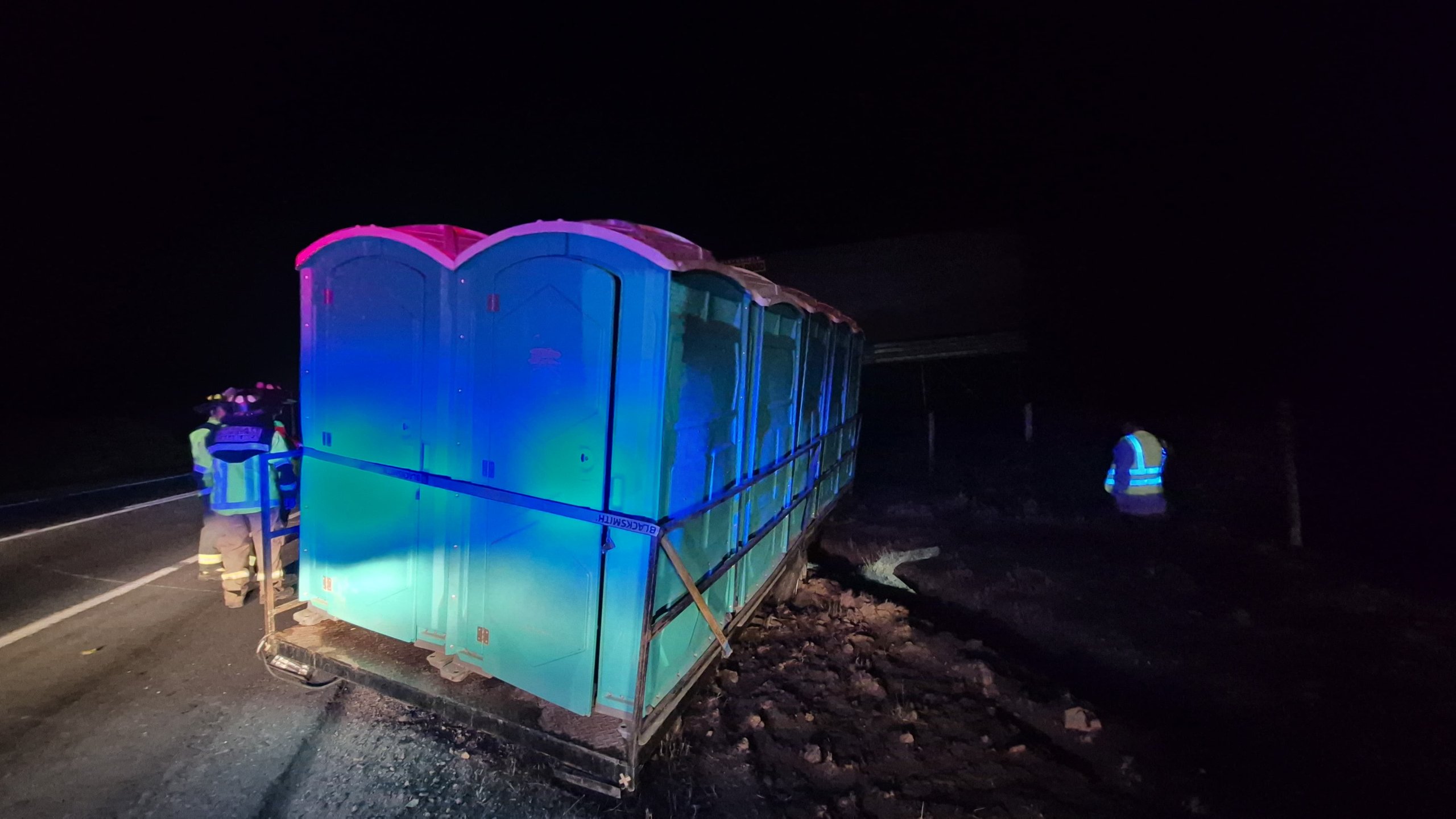 Dos personas resultaron lesionadas luego de que un camión que transportaba baños químicos volcara en la ruta F-90, en la región de Valparaíso.