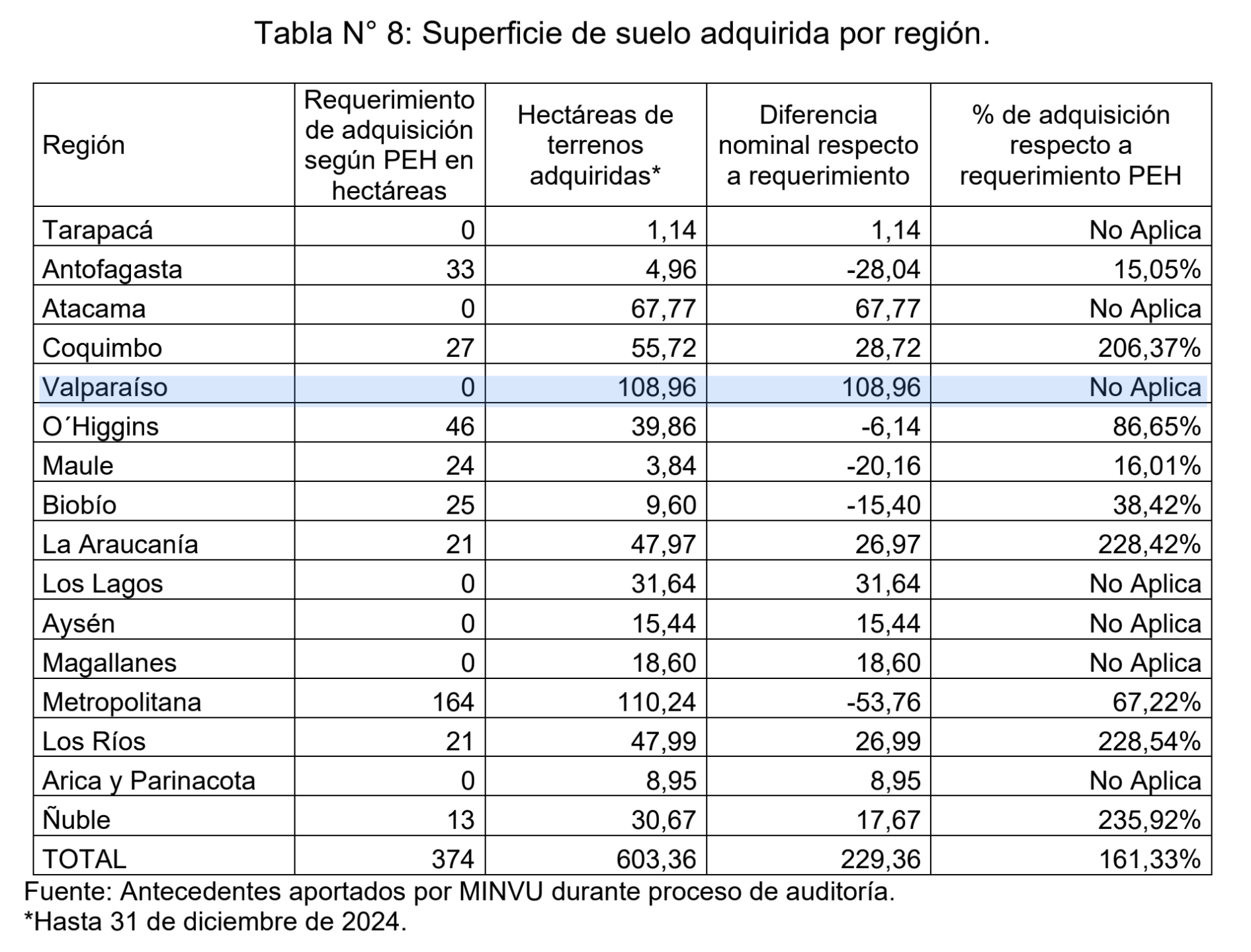 En las regiones de Coquimbo, La Araucanía, Los Ríos y Ñuble, se adquirieron superficies que superaron el doble de lo solicitado según la proyección del PEH. Por su parte, en las regiones de Antofagasta, O ́Higgins, Maule, Biobío y Metropolitana, a la fecha de corte de la evaluación (31 de diciembre de 2024), no se había alcanzado la superficie de suelo prevista en el PEH, siendo los casos más significativos Antofagasta y Maule, con la adquisición de solo un 15% y 16% del suelo requerido, respectivamente.