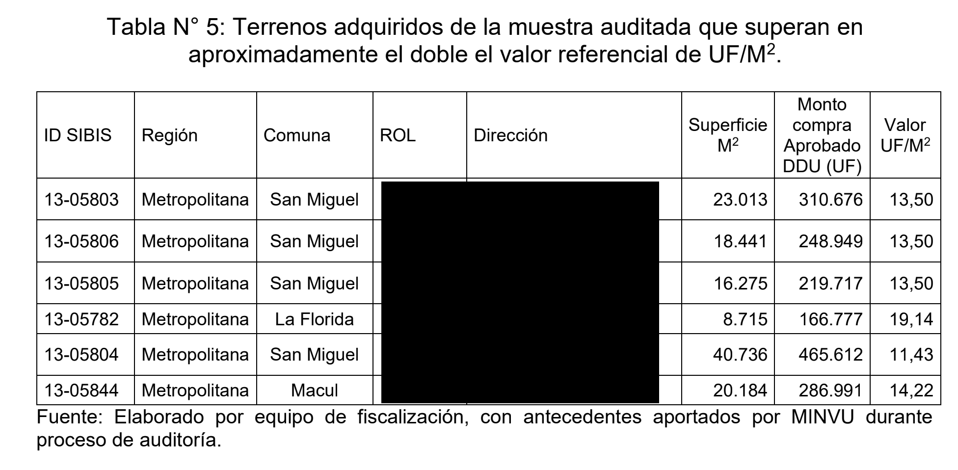 En otro de los puntos del informe, se evidenció que aun cuando para la ejecución del Plan de Emergencia Habitacional se definió un valor referencial del suelo, a partir del cual se estimaron los recursos económicos necesarios para cumplir las metas previstas; y considerando que la Ley sobre Gestión de Suelo para la Integración Social y Urbana y el PEH establecieron la necesidad de dictar un reglamento que fijara rangos de precios de los terrenos a adquirir, del análisis de los antecedentes proporcionados por el Minvu durante la auditoría, no se identificó que dicha entidad hubiese establecido algún rango de precios, a nivel nacional o regional, para estas compras.