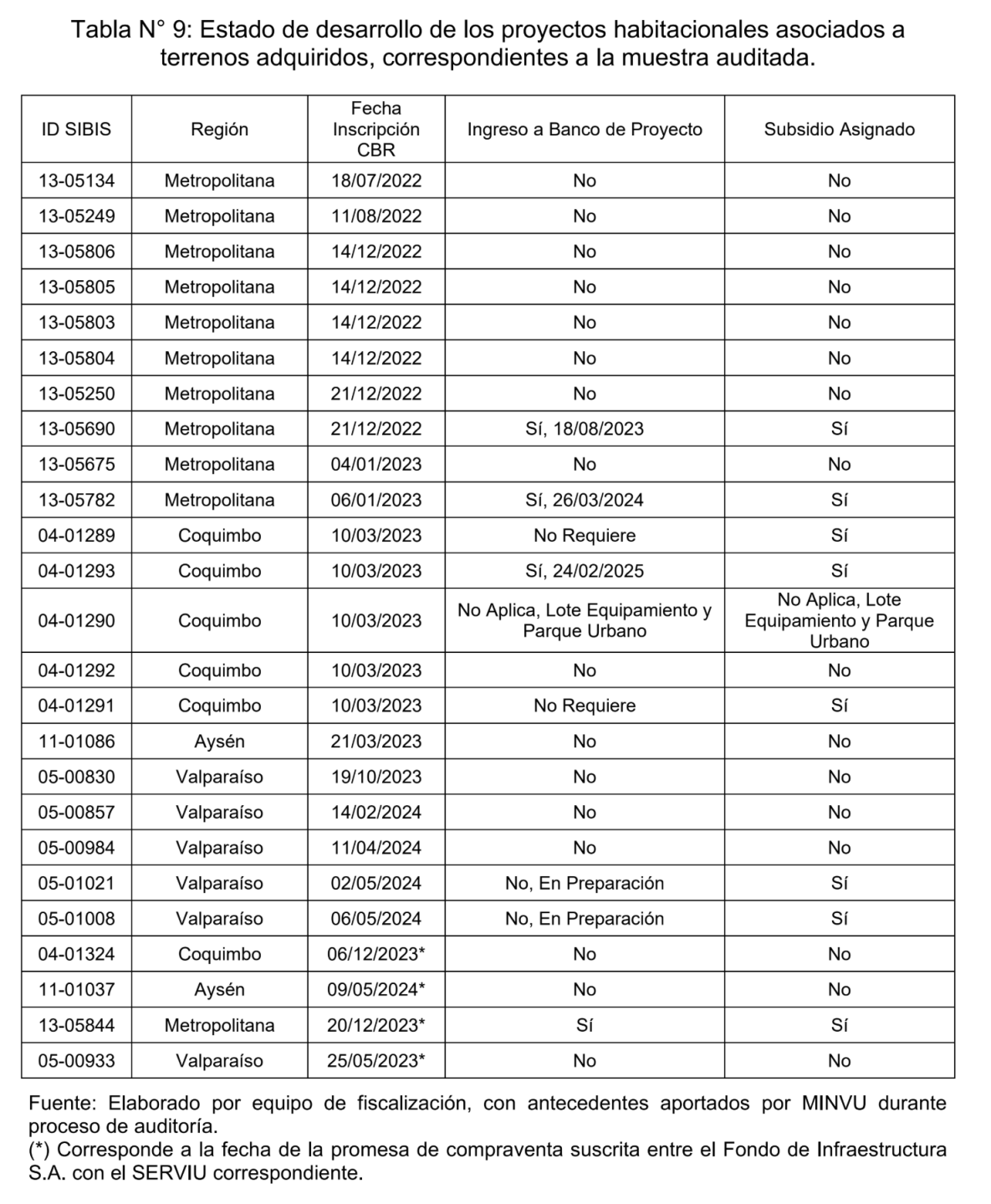 Respecto a los 25 terrenos analizados, adquiridos por los Serviu de Valparaíso, Coquimbo, Metropolitana y Aysén, en el marco del Plan de Emergencia Habitacional, en 16 casos, no existe un proyecto de viviendas asociado, ingresado al Banco de Proyectos del Ministerio, plataforma donde se preparan, evalúan y postulan proyectos habitacionales que participan del programa Fondo Solidario de Elección de Vivienda, para la construcción de viviendas con el objeto de disminuir el déficit habitacional. En 16 casos hay terrenos adquiridos hace más de 3 años por parte de estos Serviu.