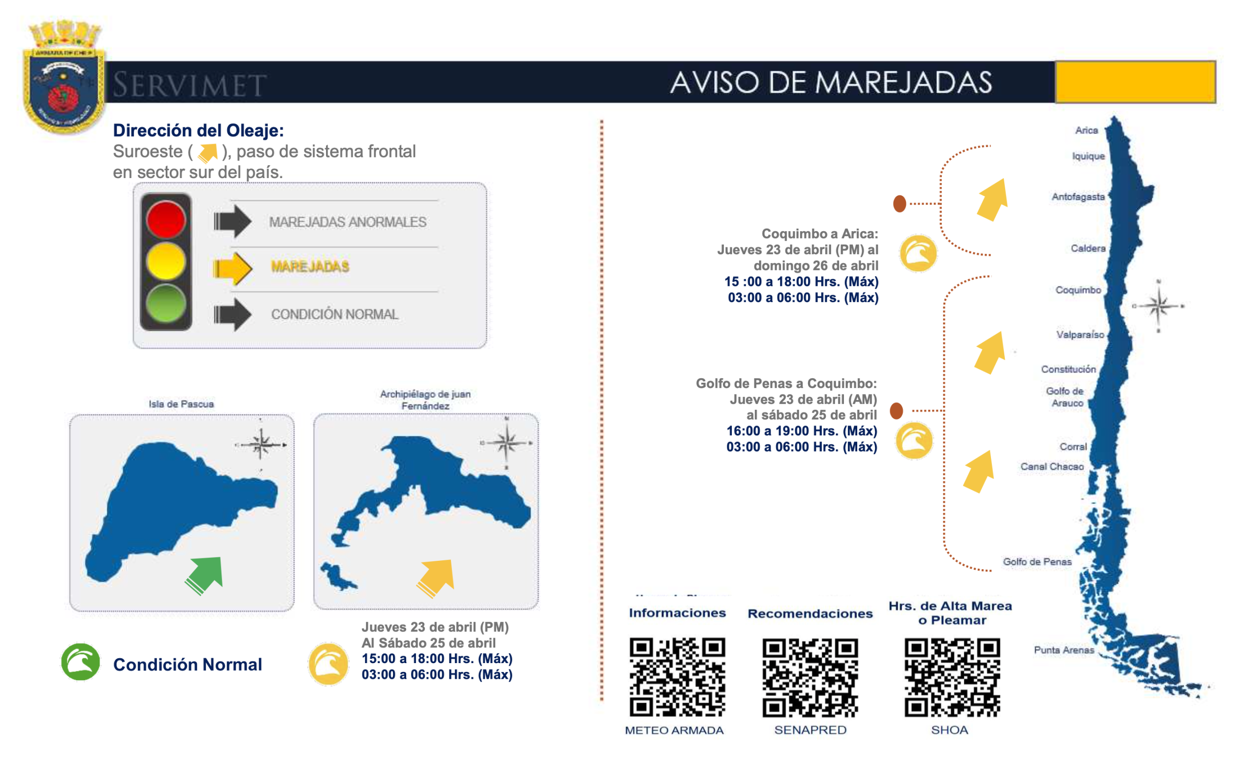 El jefe del Centro Zonal de Meteorología Marina de Valparaíso, capitán de Fragata Carlos Gaete, explicó que "debido a un activo sistema frontal que afectará el sector sur del país, esperamos marejadas con dirección del suroeste a contar del jueves 23 de abril en nuestro litoral, afectando desde Golfo de Penas hasta Arica, incluyendo el archipiélago Juan Fernández, generando oleaje con rompiente en bahías abiertas a esa dirección".