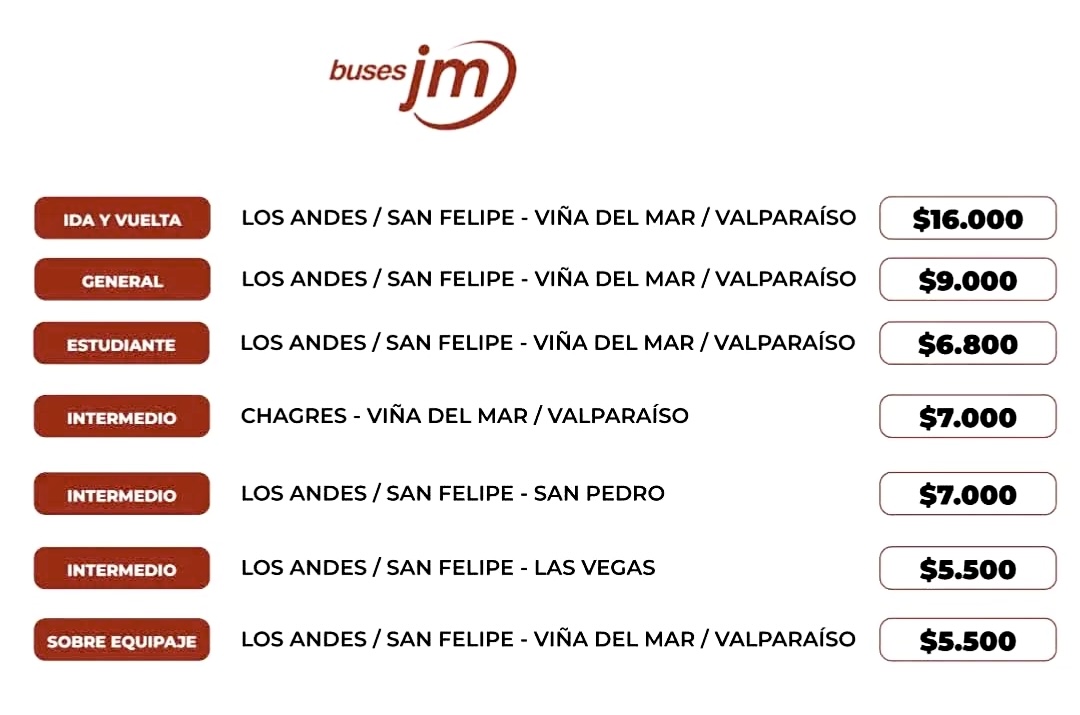 Bajo este mismo contexto, este medio de comunicación tomó conocimiento de una situación similar con la empresa Buses JM, que conecta ciudades del Valle de Aconcagua con las de la provincia de Valparaíso. La compañía aumentó la tarifa general a $9.000; el viaje ida y vuelta entre Los Andes/San Felipe y Valparaíso/Viña del Mar a $16.000; la tarifa estudiantil a $6.800; y el pasaje intermedio a $7.000.