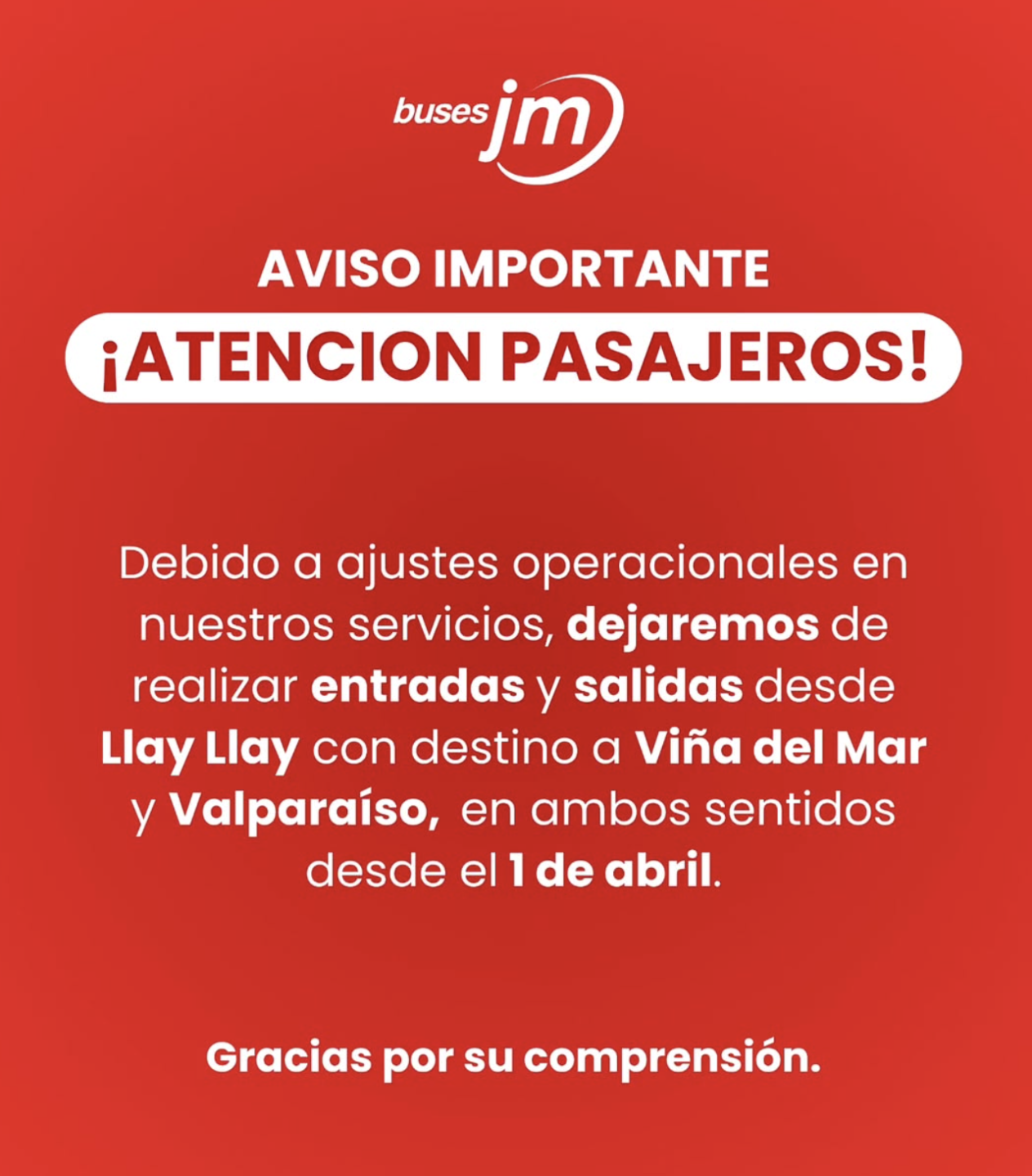 “Debido a ajustes operacionales en nuestros servicios, dejaremos de realizar entradas y salidas desde Llay Llay con destino a Viña del Mar y Valparaíso, en ambos, sentidos desde el 1 de abril. Gracias por su comprensión”, informó la empresa a través de una escueta declaración publicada en sus redes sociales.