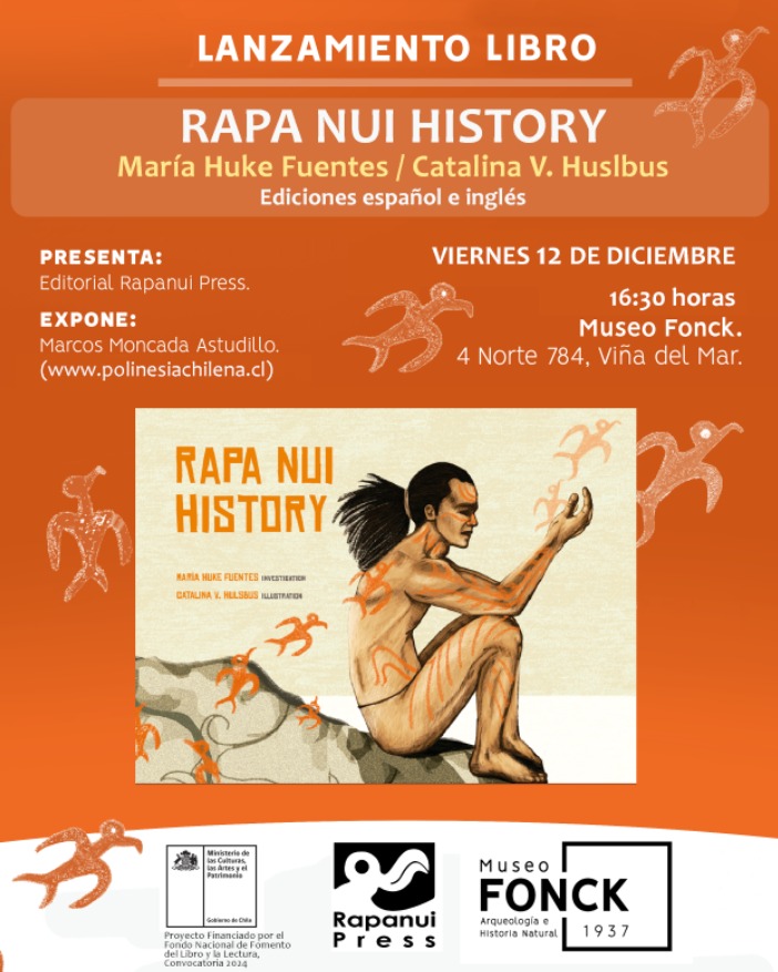 Este viernes 12 a las 16:30 horas, en el Museo Fonck de Viña del Mar se presentará el libro «Rapa Nui History», de la historiadora rapanui María Huke Fuentes, que cuenta con una colorida y didáctica cantidad de ilustraciones realizadas por la artista Catalina Hulsbus, que convierten esta investigación histórica en una amena experiencia, sobre todo para público juvenil.