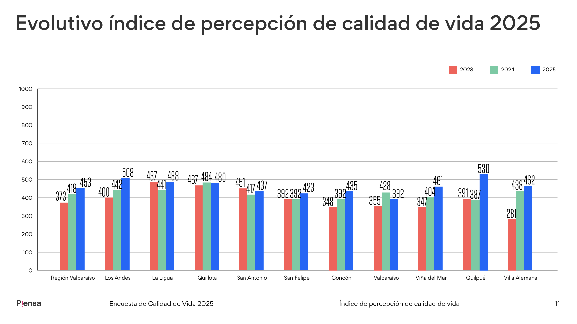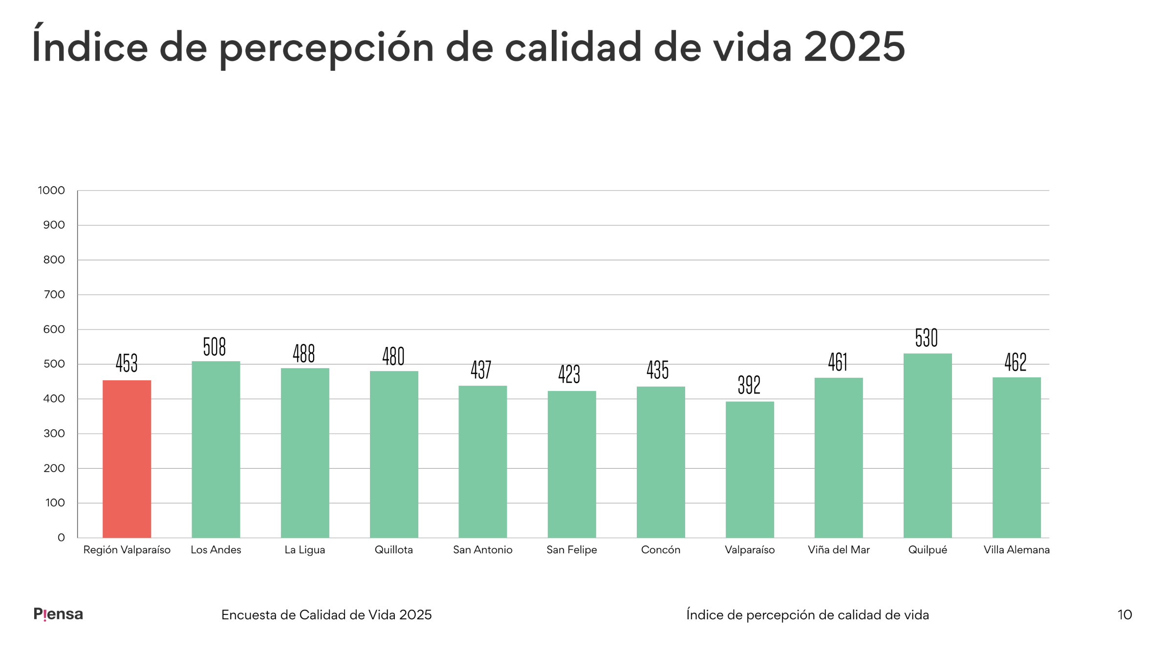 En este contexto, el índice de percepción de calidad de vida 2025 muestra que la región de Valparaíso llega a 453 (de un máximo de 1.000). Por encima del promedio regional y encabezando a las 10 comunas analizadas en este estudio, Quilpué se posiciona en primer lugar con 530. Le sigue más atrás Los Andes con 508. Bajando de la barrera de los 500, pero por encima del promedio regional, se ve a La Ligua (488), Quillota (480), Villa Alemana (462) y Viña del Mar (461). Como contraparte, debajo del promedio regional están San Antonio (437), Concón (435), San Felipe (423) y Valparaíso (392).