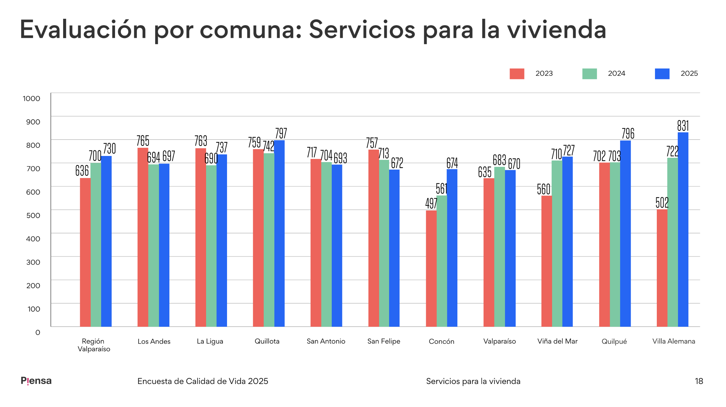 En el ítem «Servicios para la vivienda», que evalúa retiro domiciliario de basura, servicio de agua potable, sistema de alcantarillado y servicio eléctrico en estas 10 comunas, la región de Valparaíso anota 730, cifra superior a los 636 de 2023 y de los 700 de 2024.