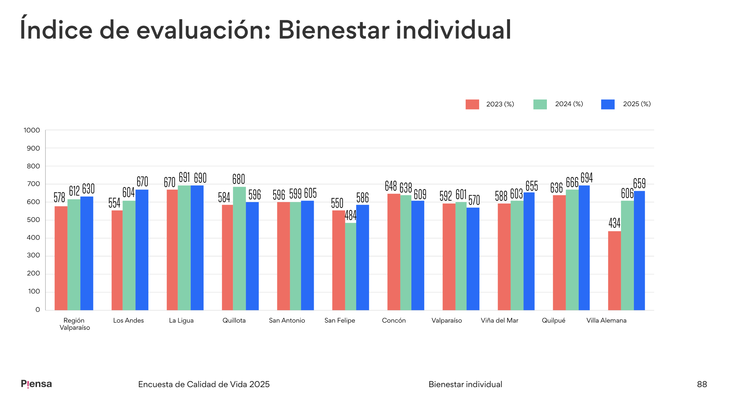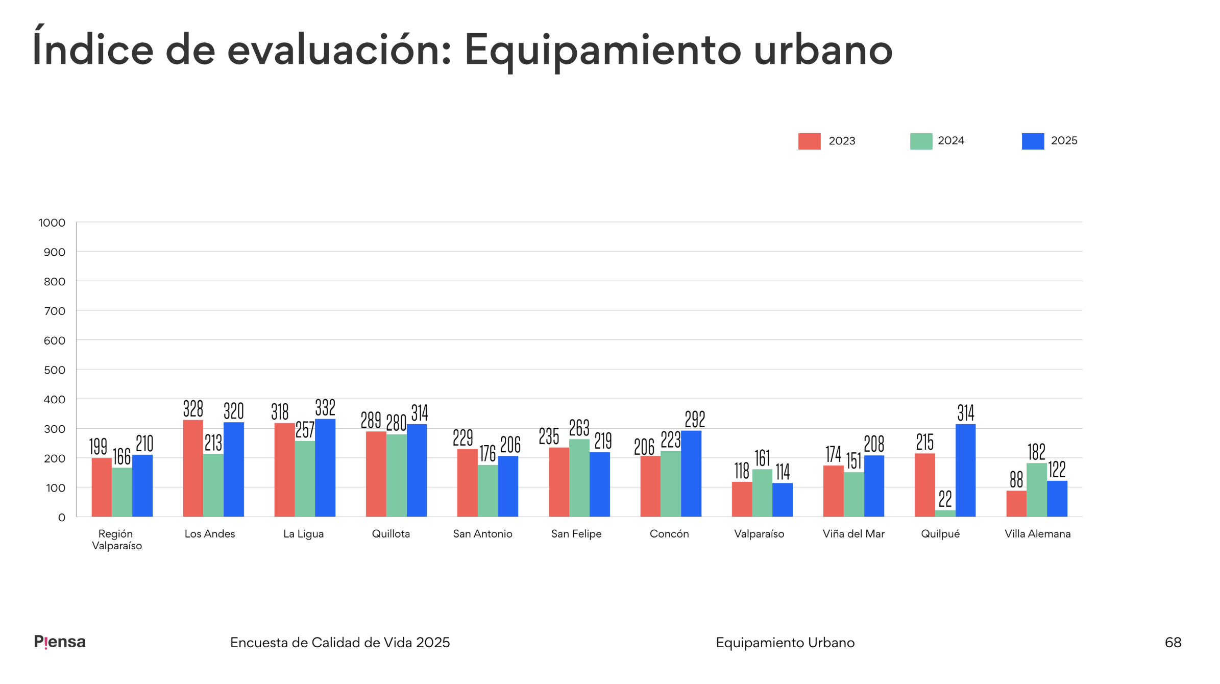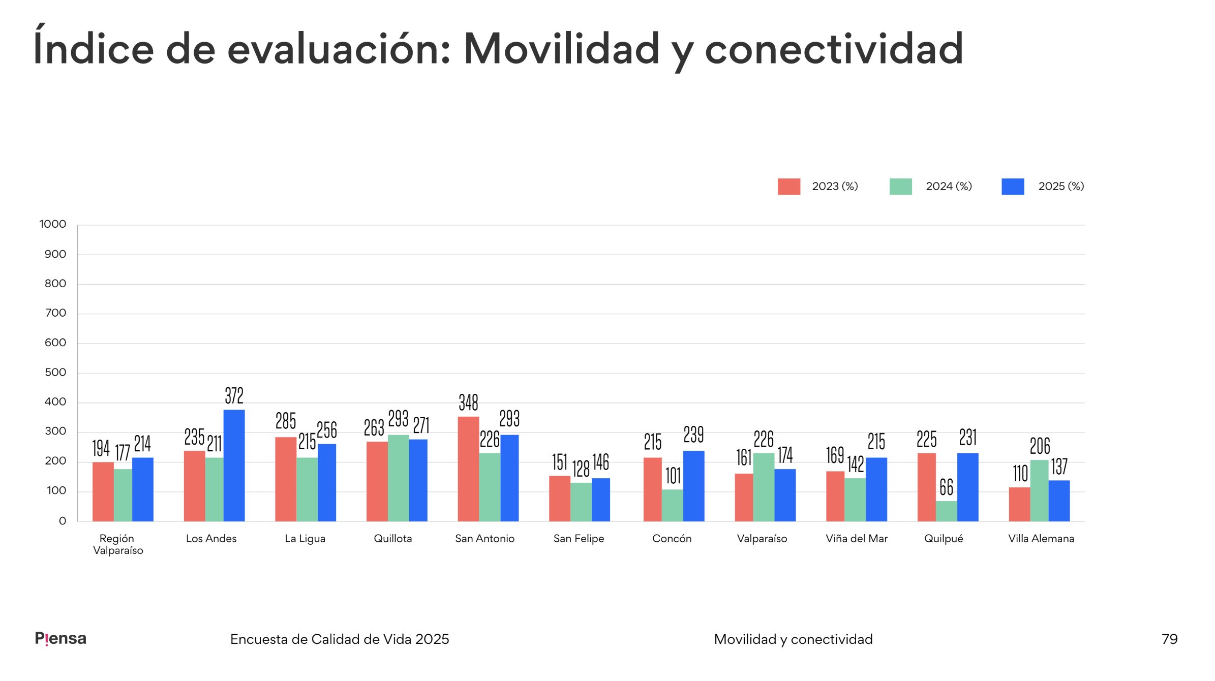 Para concluir, estos resultados de la Encuesta de Calidad de Vida 2025 de Fundación Piensa dejan en evidencia una mejora sostenida en la percepción regional respecto de años anteriores, aunque con profundas brechas territoriales que persisten y se agudizan en dimensiones clave. Mientras comunas como Quilpué, Los Andes y Villa Alemana logran consolidar avances transversales, otras ciudades –Valparaíso principalmente– sigue enfrentando rezagos estructurales en seguridad, equipamiento urbano y movilidad, ámbitos que inciden directamente en la vida cotidiana de sus habitantes.