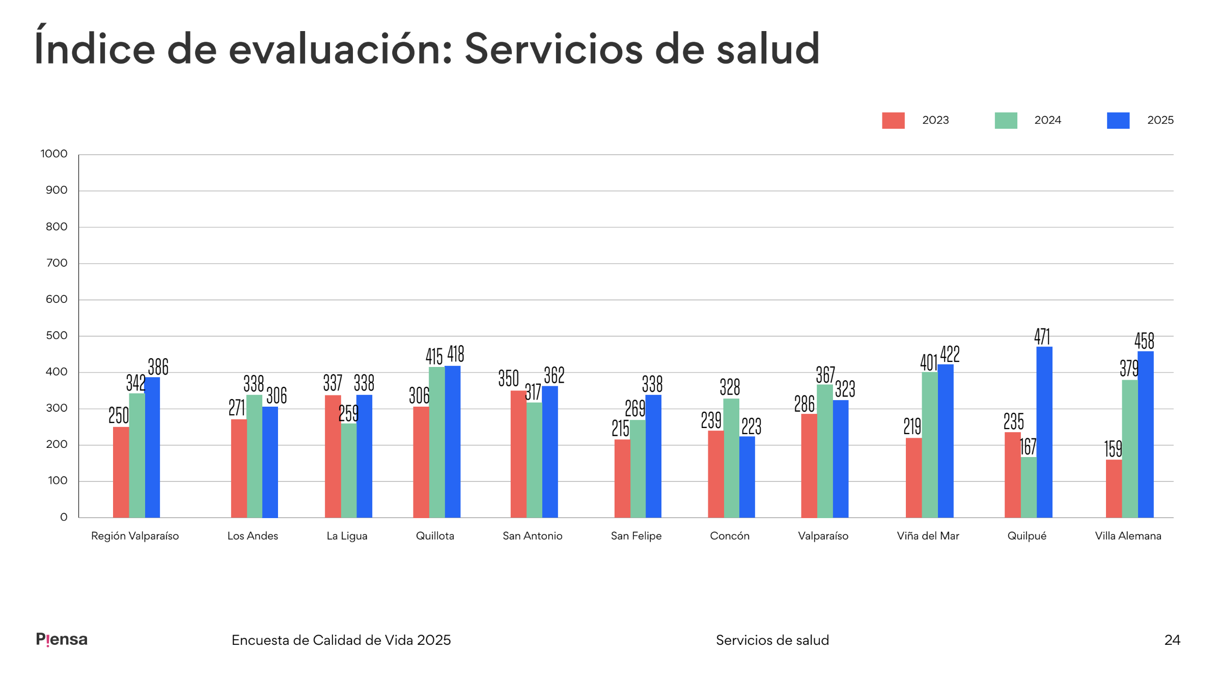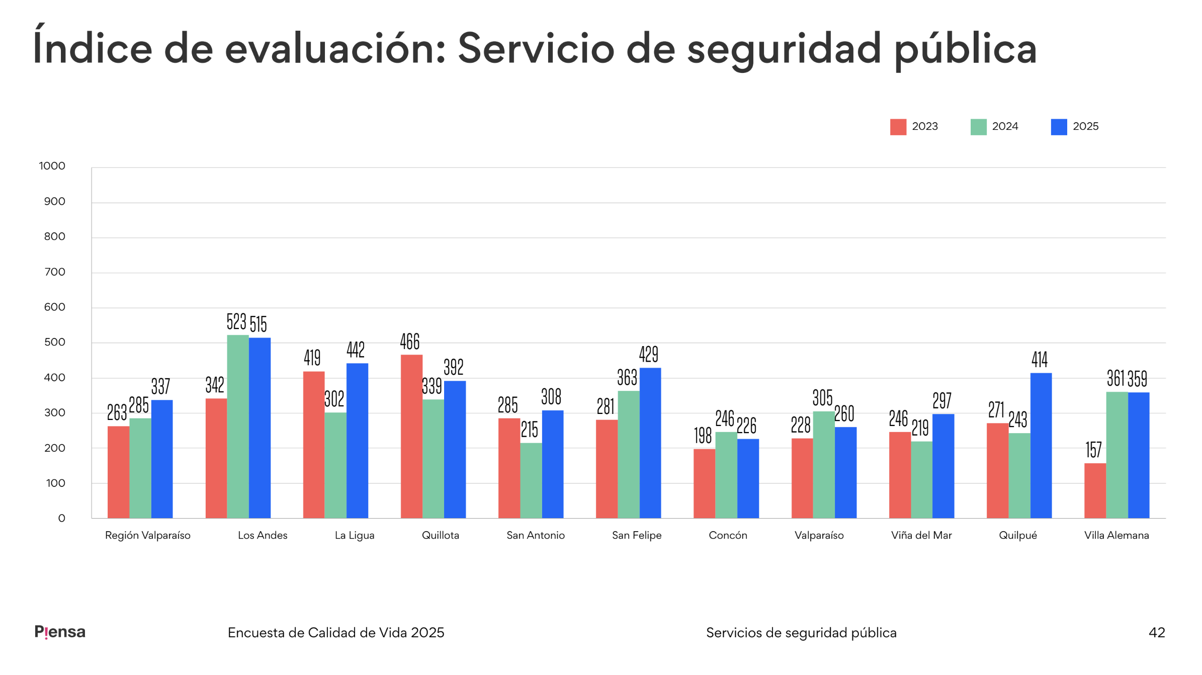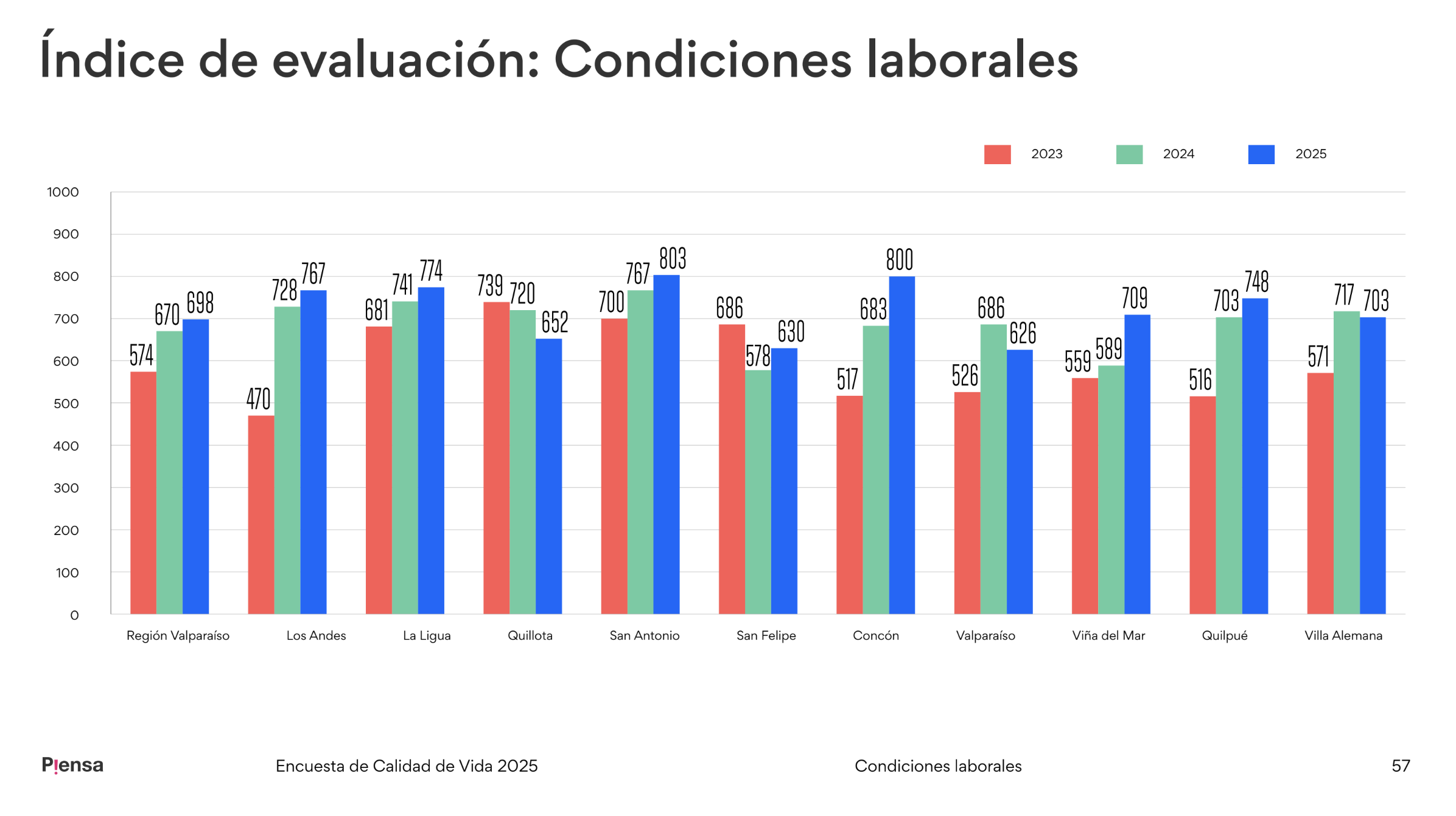 Para concluir, estos resultados de la Encuesta de Calidad de Vida 2025 de Fundación Piensa dejan en evidencia una mejora sostenida en la percepción regional respecto de años anteriores, aunque con profundas brechas territoriales que persisten y se agudizan en dimensiones clave. Mientras comunas como Quilpué, Los Andes y Villa Alemana logran consolidar avances transversales, otras ciudades –Valparaíso principalmente– sigue enfrentando rezagos estructurales en seguridad, equipamiento urbano y movilidad, ámbitos que inciden directamente en la vida cotidiana de sus habitantes.