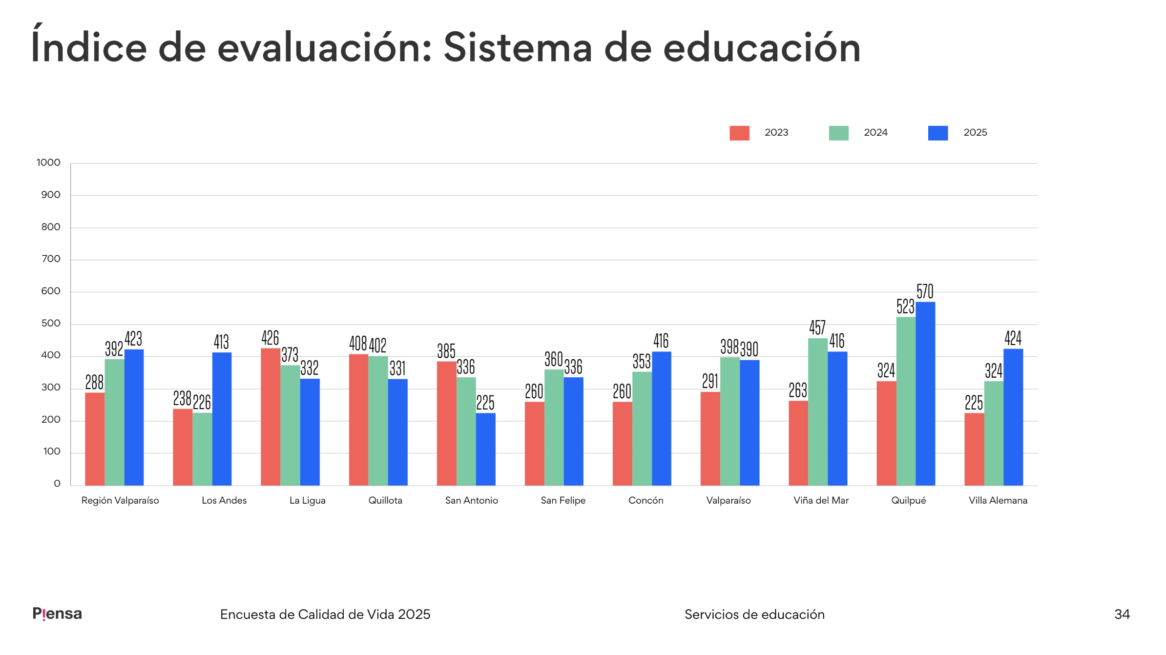 Haciendo el análisis por comuna, Quilpué es la que reporta las mejores cifras, con un índice de 570, siendo la disponibilidad de educación básica el mejor servicio evaluado por los habitantes de la Ciudad del Sol. Sobre el promedio regional aparece sólo Villa Alemana, con un índice de 424, y disponibilidad de educación preescolar como el servicio mejor evaluado por sus vecinos. Como contraparte, San Antonio reporta la peor evaluación, con sólo 225 y disponibilidad de educación superior como el peor servicio.