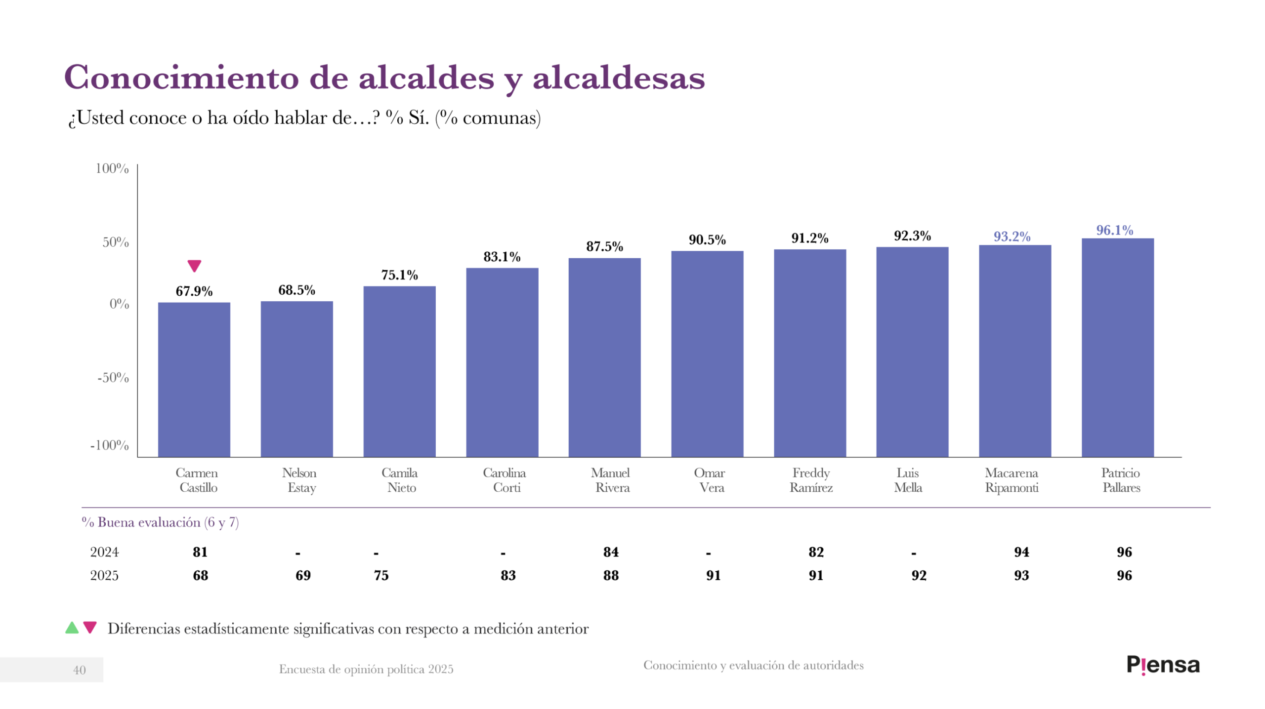En materia de conocimiento de autoridades, el primer lugar, con un impresionante 96,1%, lo tiene el alcalde de La Ligua, Patricio Pallares. Le sigue la alcaldesa de Viña del Mar, Macarena Ripamonti, quien alcanza un 93,2% de conocimiento. El podio lo completa el jefe comunal de Quillota, Luis Mella, quien se queda con un 92,3%.