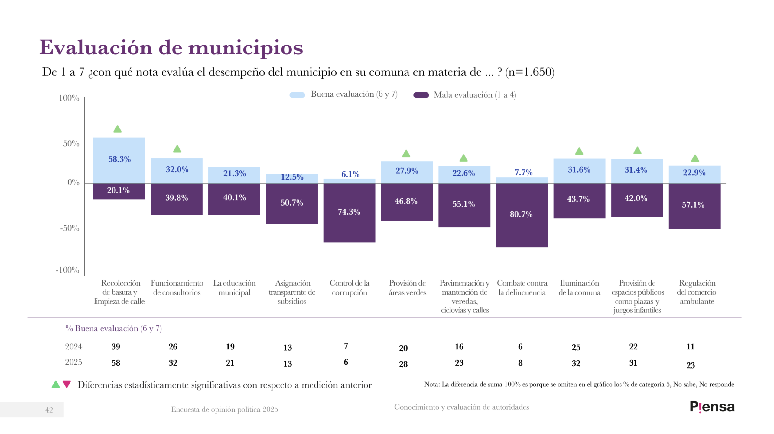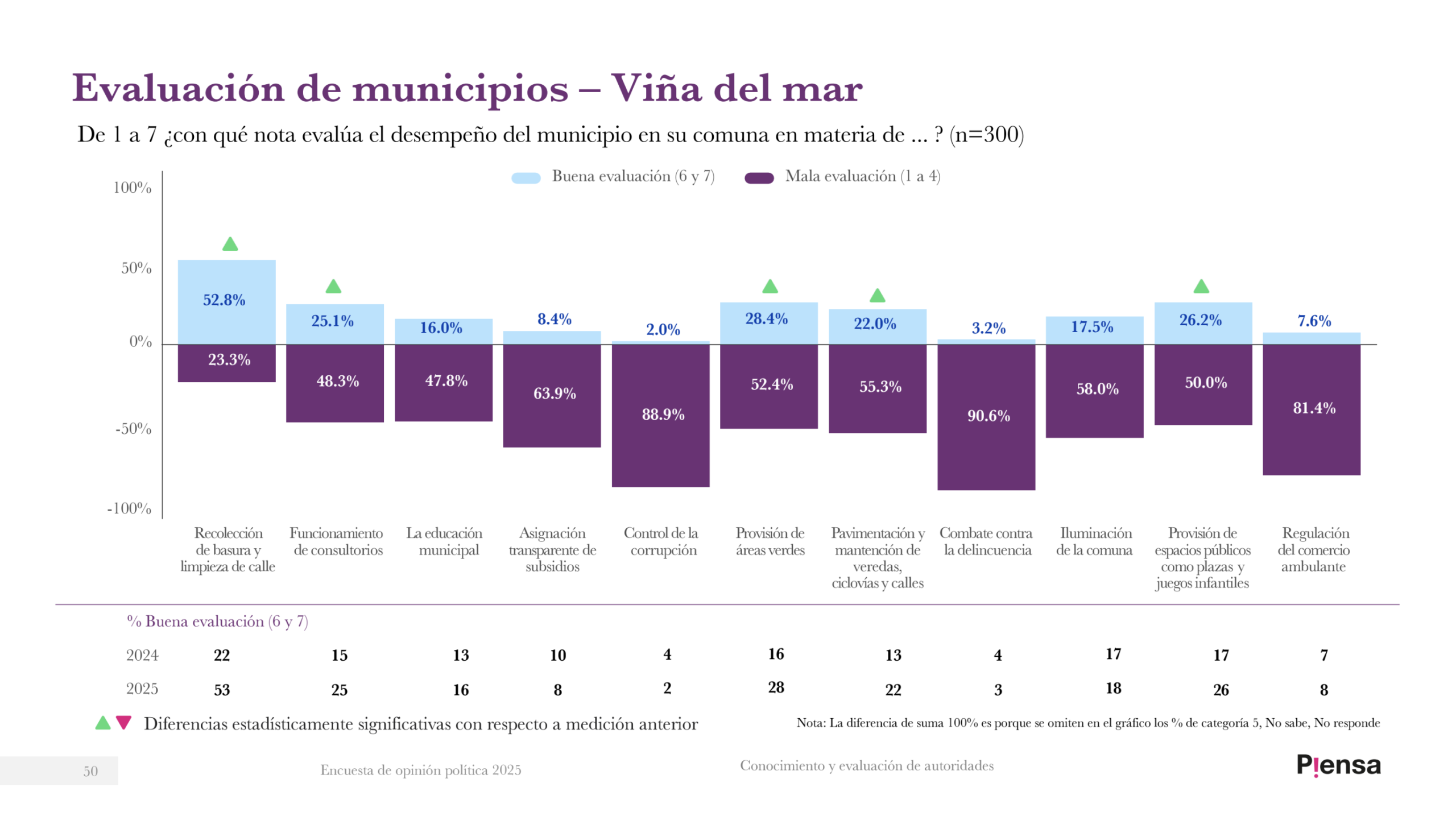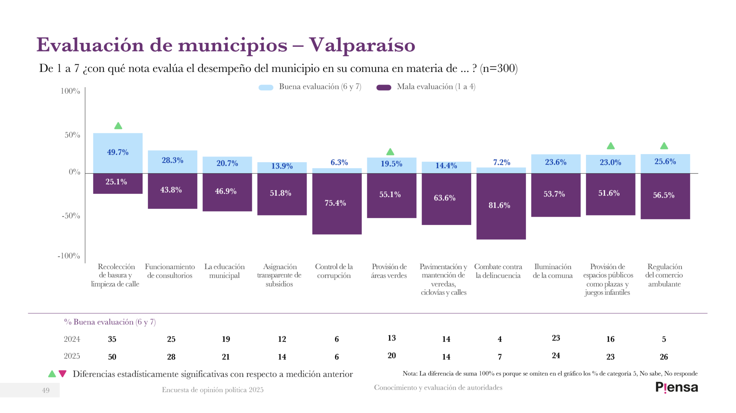 Al poner la lupa sobre los cinco municipios del área metropolitana, se observa que en Valparaíso, el ítem que peor evaluación tiene entre los porteños es el del «Combate contra la delincuencia», con 81,6%; seguido por el «Control de la corrupción», con 75,4%, muy en la línea con los resultados generales a nivel regional. El que mejor evaluación reporta es «Recolección de basura y limpieza de calle», con 49,7% de valoración.