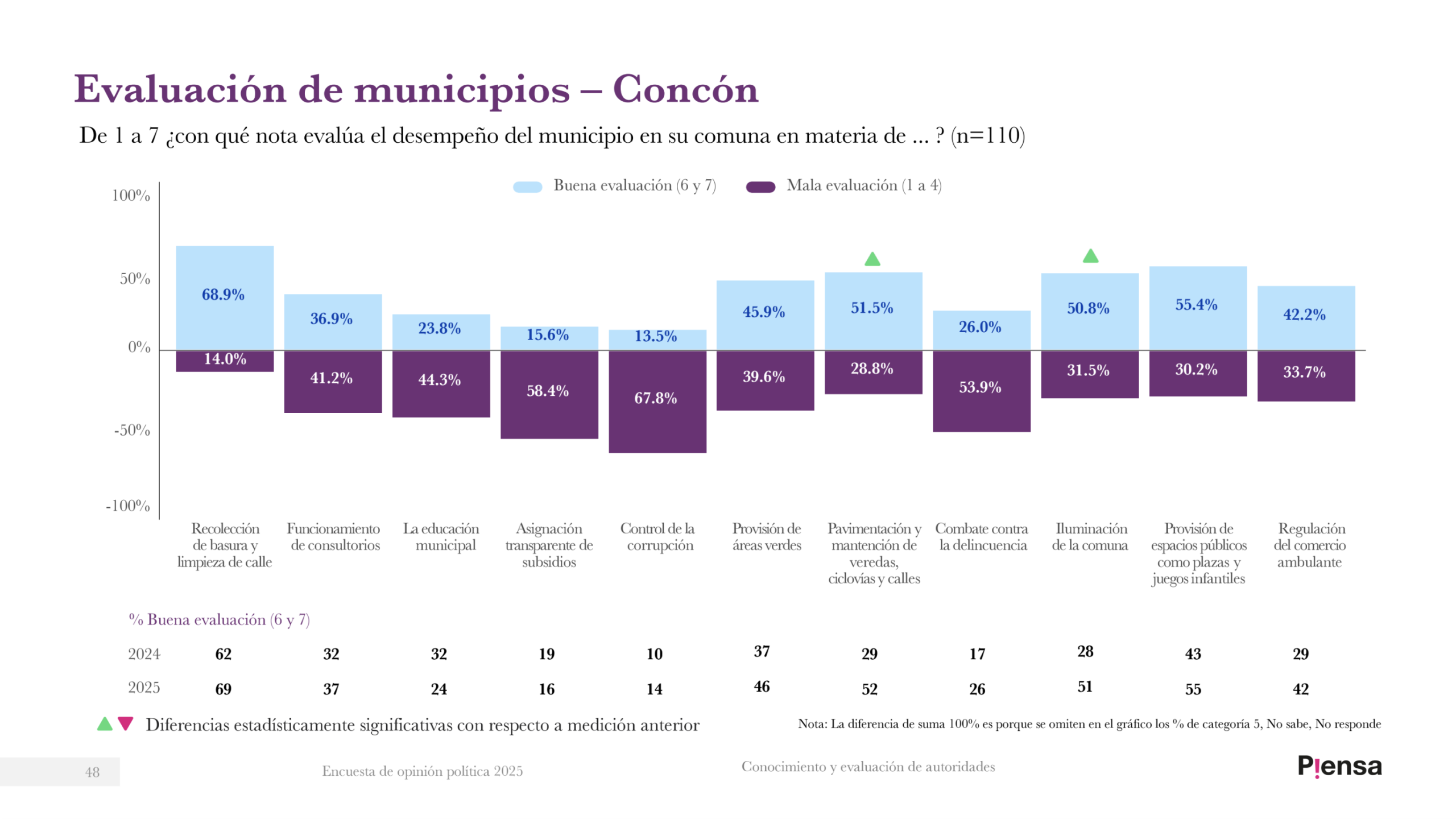 Entre la comunidad de Concón, la peor evaluación municipal la reportan en el ítem «Control de la Corrupción», con 67,8% y «Asignación transparente de subsidios», con 58,4%. Al igual que en Viña y Valparaíso, la categoría «Recolección de basura y limpieza de calle» es el mejor evaluado, con 68,9% de valoración positiva entre la comunidad.