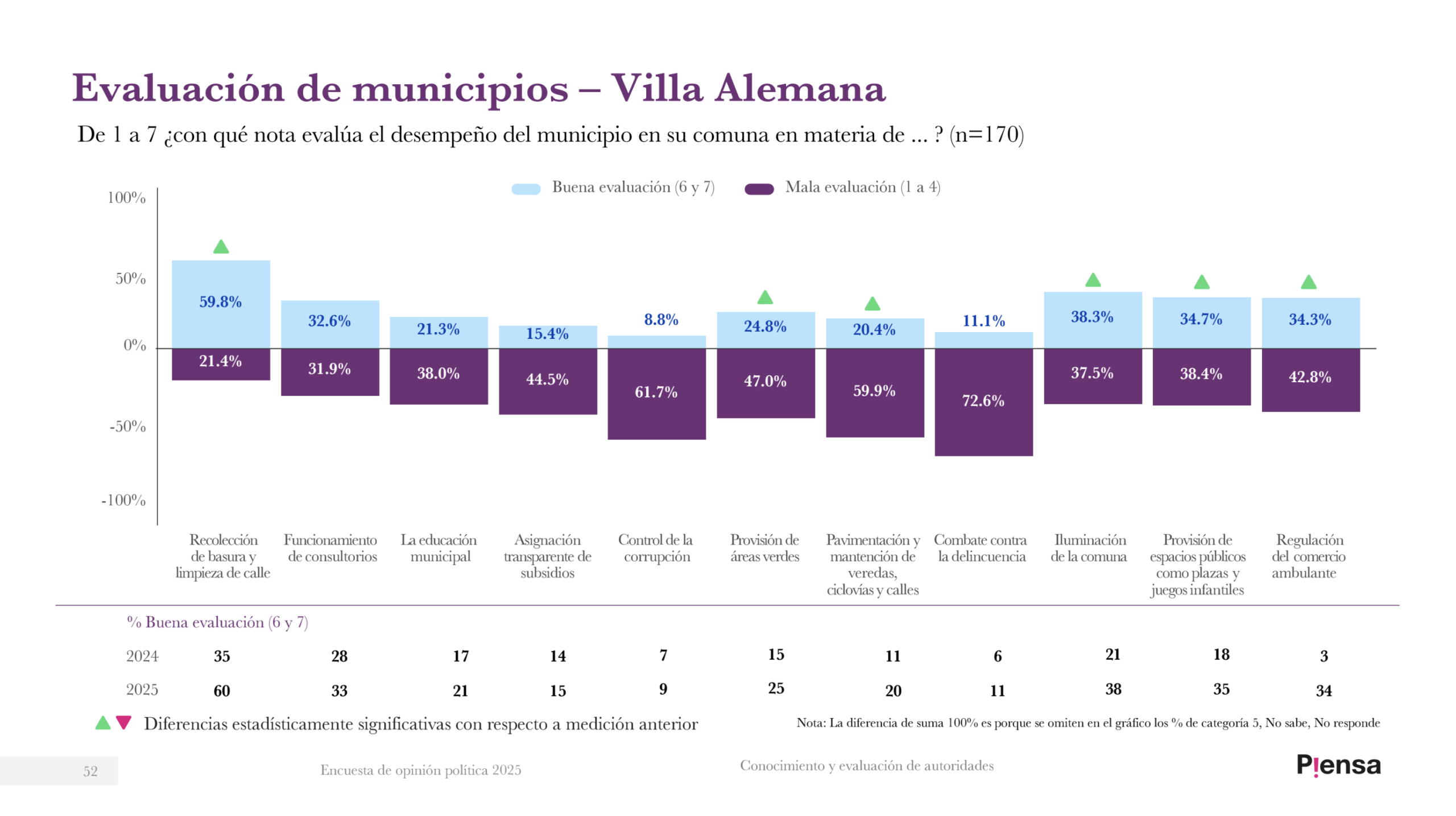 La tónica se repite en Quilpué y Villa Alemana, donde «Combate contra la delincuencia», con 83,4% y 72,6% de evaluación negativa, es el ítem que más rechaza la ciudadanía respecto a sus municipios. En cuanto a «Control de la corrupción», los vecinos de Quilpué le dan un 79,1% de evaluación negativa, mientras que en Villa Alemana llega a 61,7%. «Recolección de basura y limpieza de calles», en tanto, es el más valorado por los vecinos de ambas comunas, con 68,1% y 59,8% respectivamente.