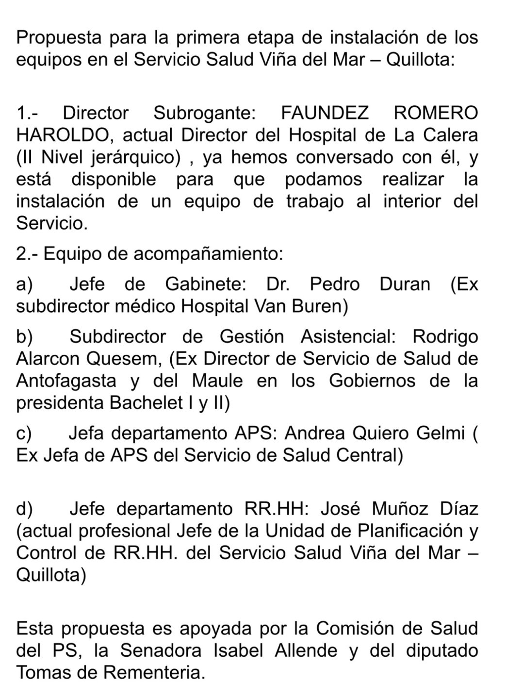 En concreto, el documento proponía a Andrea Quiero como jefa del Departamento de Atención Primaria de Salud (APS) y a José Muñoz, en ese entonces profesional jefe de la Unidad de Planificación y Control de RR.HH. del SSVQ, para que asumiera la jefatura del Departamento de Recursos Humanos (RR.HH.) de la entidad.