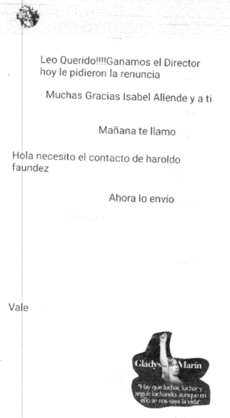 Asimismo, se da cuenta de mensajes que sugieren resultados ya definidos en procesos de dirección, como: "Ganamos, al Director hoy le pidieron la renuncia. Muchas gracias a Isabel Allende (exsenadora del PS por la Quinta Región) y a ti", además de solicitudes de apoyo para asumir cargos vacantes dentro del servicio. "Yo necesito apoyo para asumir la Subdirección Administrativa, que está vacante desde el 18 de enero pasado cuando fue cesada Alis Catalán (RN)", reza el mensaje.