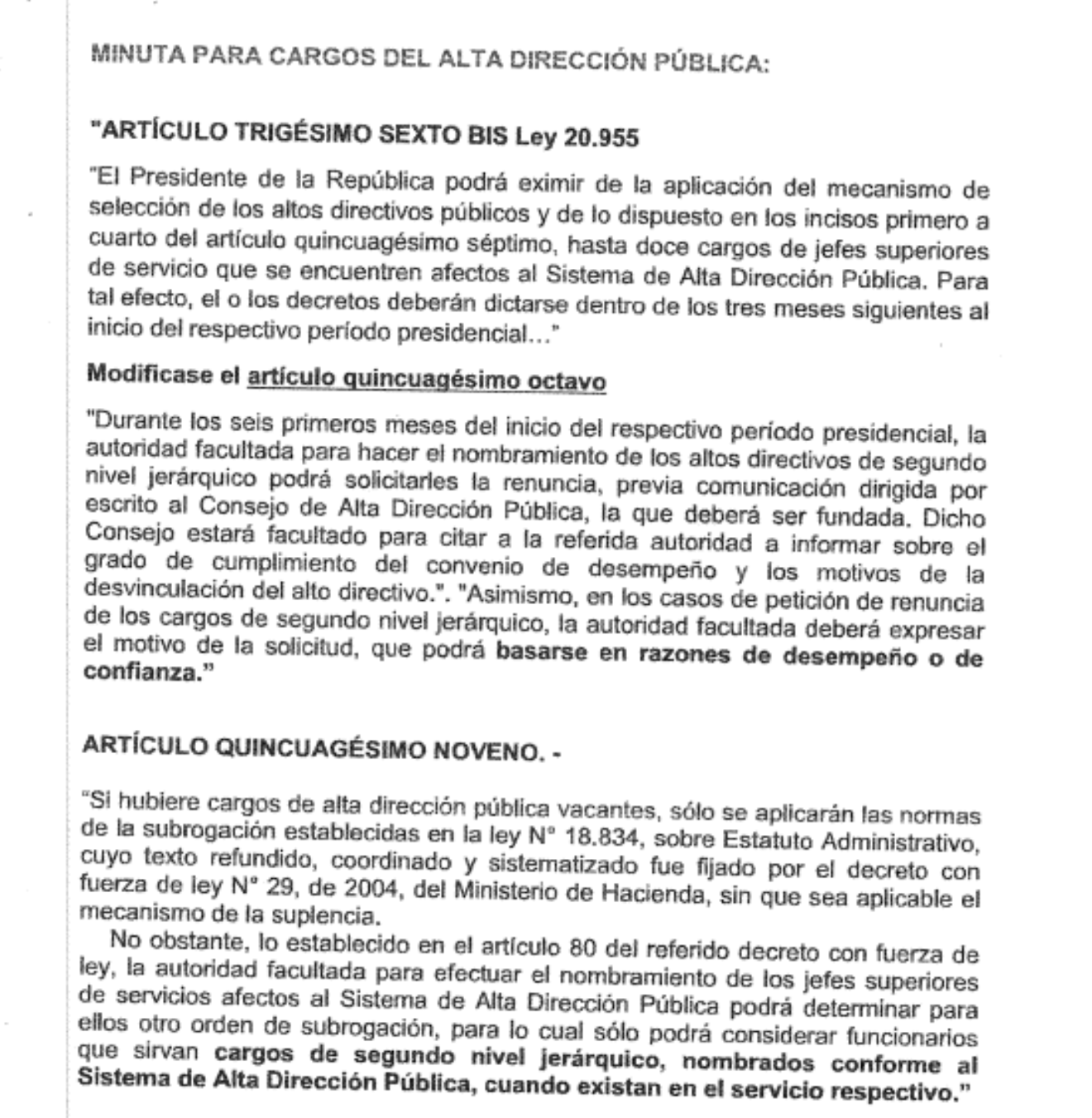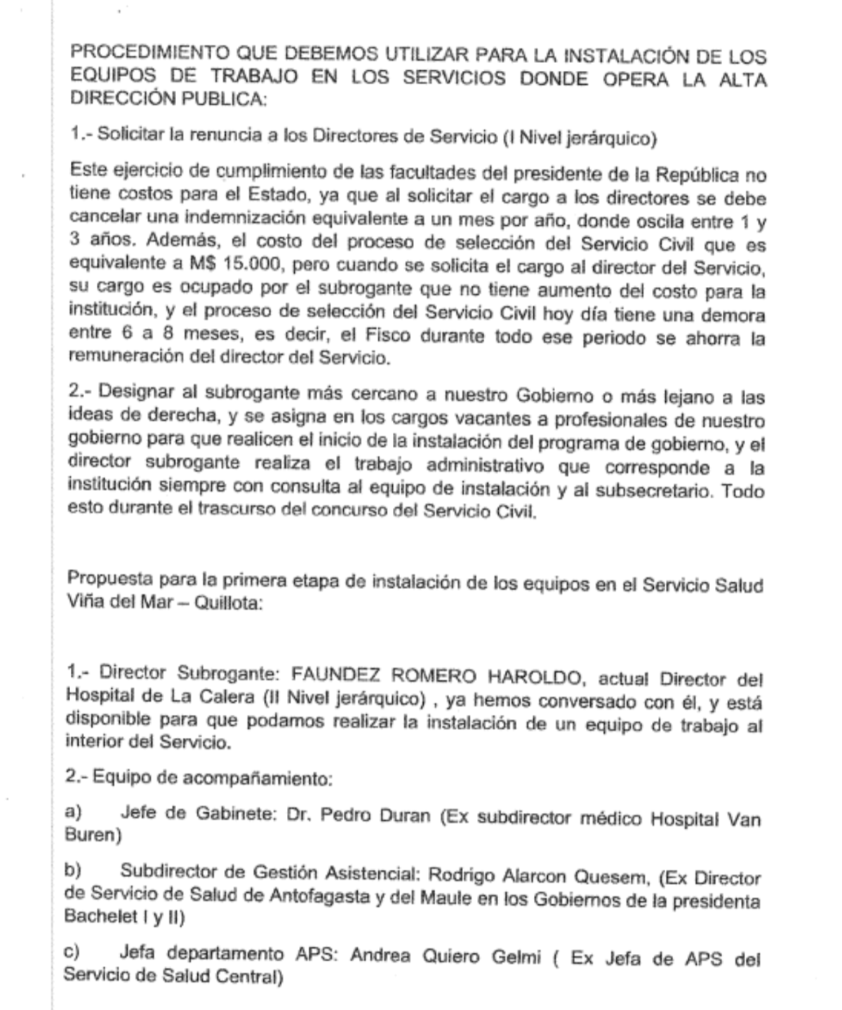 A estos antecedentes se suma un documento denominado «Minuta para cargos de alta dirección pública», sin fecha ni firma, en el que se detalla un supuesto procedimiento para instalar equipos de trabajo en Servicios de Salud donde opera el sistema de Alta Dirección Pública. En dicho texto se plantea, por ejemplo, solicitar la renuncia de directores de servicio –indicando que ello no tendría costos para el Estado– y designar subrogantes "más cercanos a nuestro Gobierno o más lejano a las ideas de derecha", mientras se desarrollan los concursos correspondientes.