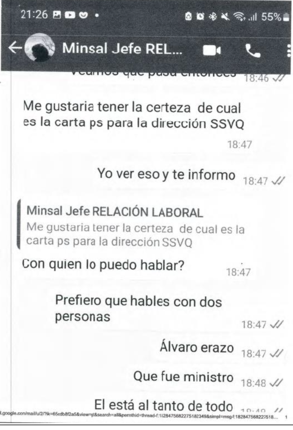 En ese contexto, el documento reproduce extractos de dichas conversaciones, donde se alude directamente a gestiones para definir nombres en cargos clave. Entre ellas, se menciona: "Me gustaría tener certeza de cuál es la carta PS para la dirección del SSVQ", así como también coordinaciones para incidir en decisiones a nivel del Ministerio de SAlud: "Creo que es necesario insistir a través de nuestro Diputado y Senadora (…) la instalación de nuestro equipo para dirigir el Servicio".