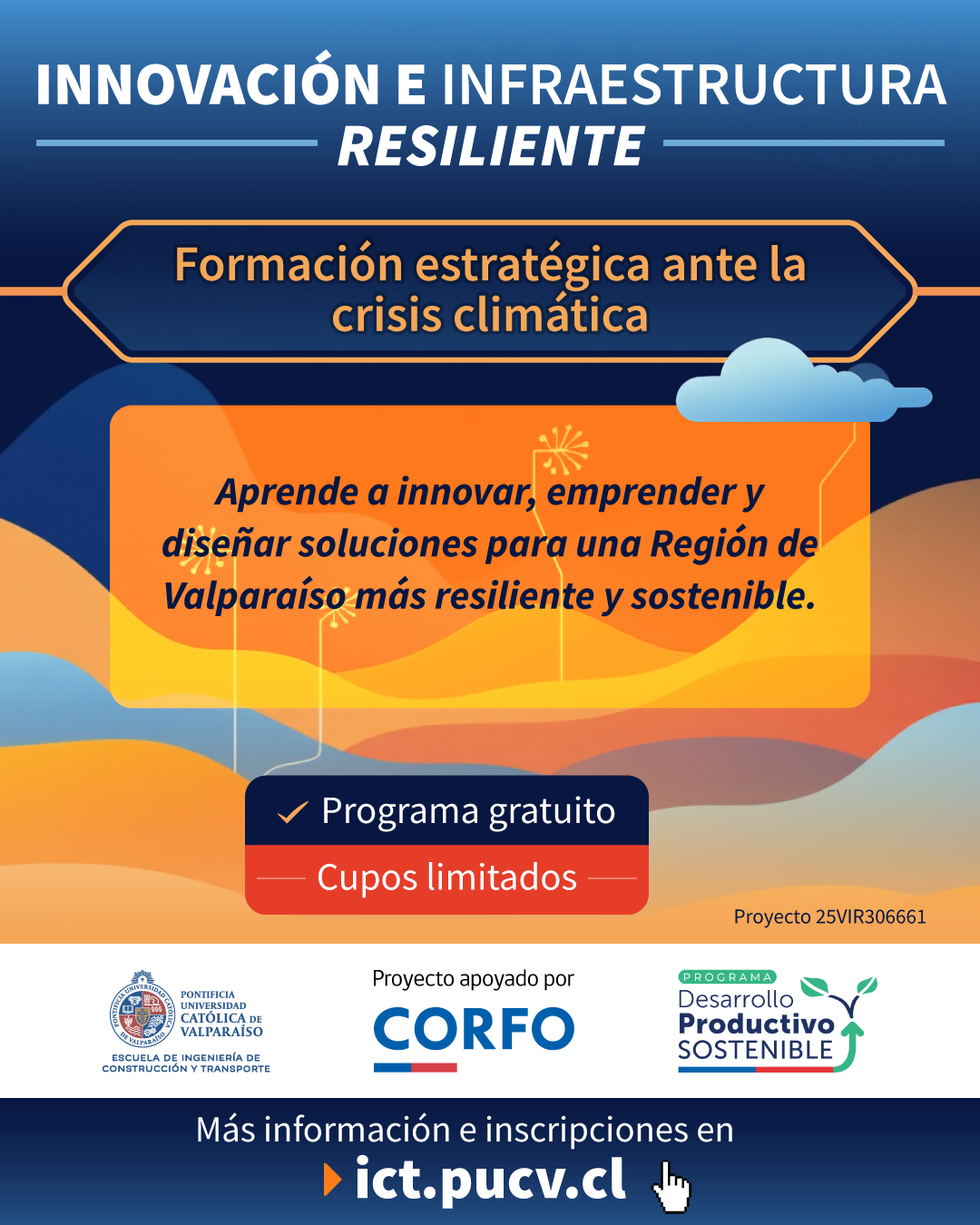 Con el objetivo de fortalecer capacidades para enfrentar los efectos del cambio climático en el territorio, la Escuela de Ingeniería de Construcción y Transporte de la Pontificia Universidad Católica de Valparaíso abrió las postulaciones al programa formativo “Innovación e infraestructura resiliente: Formación estratégica ante la crisis climática”, de carácter gratuito financiado por Corfo.