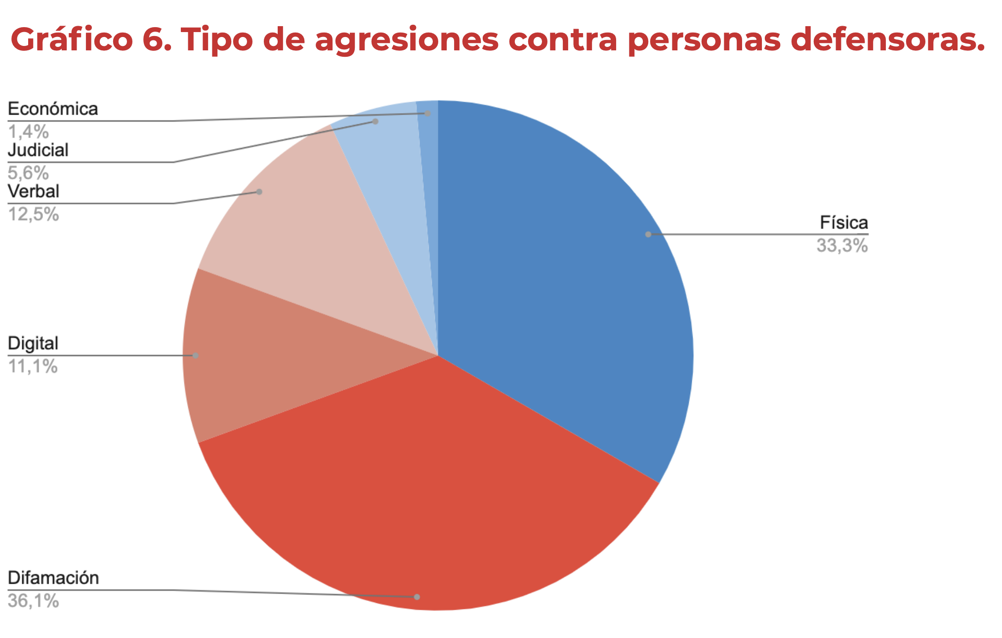 Las agresiones físicas representaron un 33,3% del total registrado, manteniendo la tendencia observada el año anterior. Junto con ello, el informe identifica un aumento significativo en la categoría de difamación, que pasó de representar un 4,2% de las agresiones en 2024 al 36,1% en 2025.
