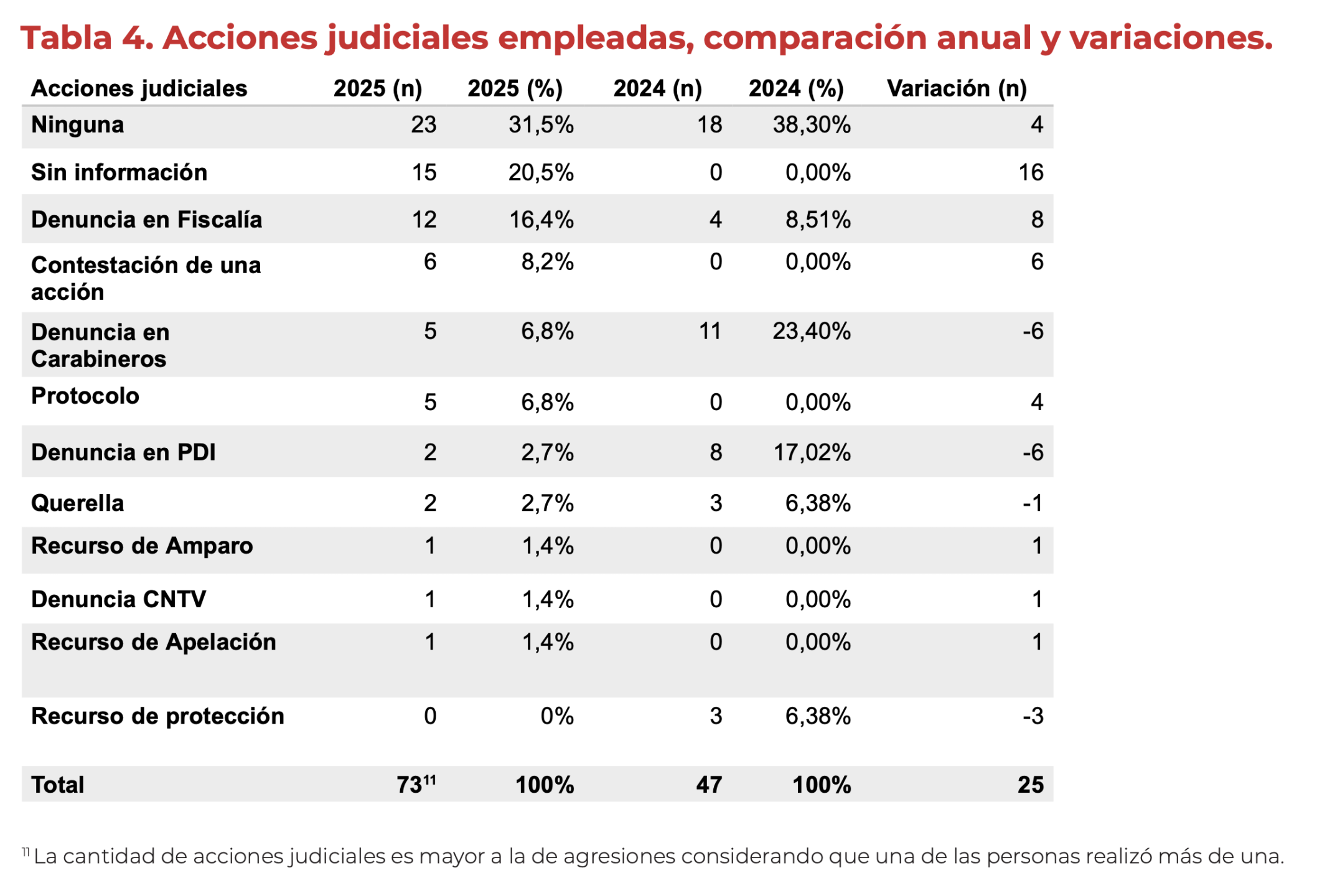 El informe sistematiza estos antecedentes a partir de un trabajo de recolección de datos de un año, la validación de cada caso con fuentes independientes —incluyendo registros públicos y causas judiciales— y su incorporación en una base que permite identificar patrones y tendencias. Por lo mismo, la organización reconoce que su informe es solo de carácter muestral, pudiendo existir un número mayor de casos y de personas que han vivido agresiones sin denunciarlas pública o institucionalmente.