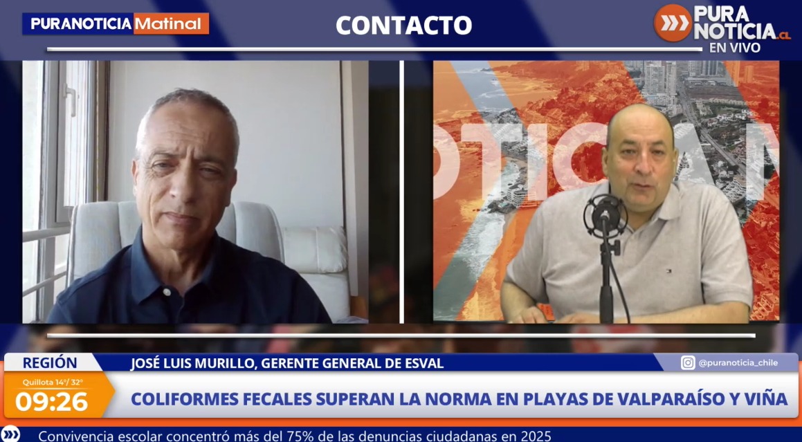 Luego del reportaje emitido por Chilevisión que alertó sobre presencia de coliformes fecales por sobre la norma en playas de Valparaíso y la nota escrita por nuestro medio Puranoticia.cl, el gerente general de Esval, José Luis Murillo, conversó en Puranoticia Matinal y descartó que el fenómeno esté vinculado a los emisarios submarinos de la sanitaria y afirmó que “la cosa está perfectamente clara en cuanto a que el emisario de Esval funciona a la perfección”.