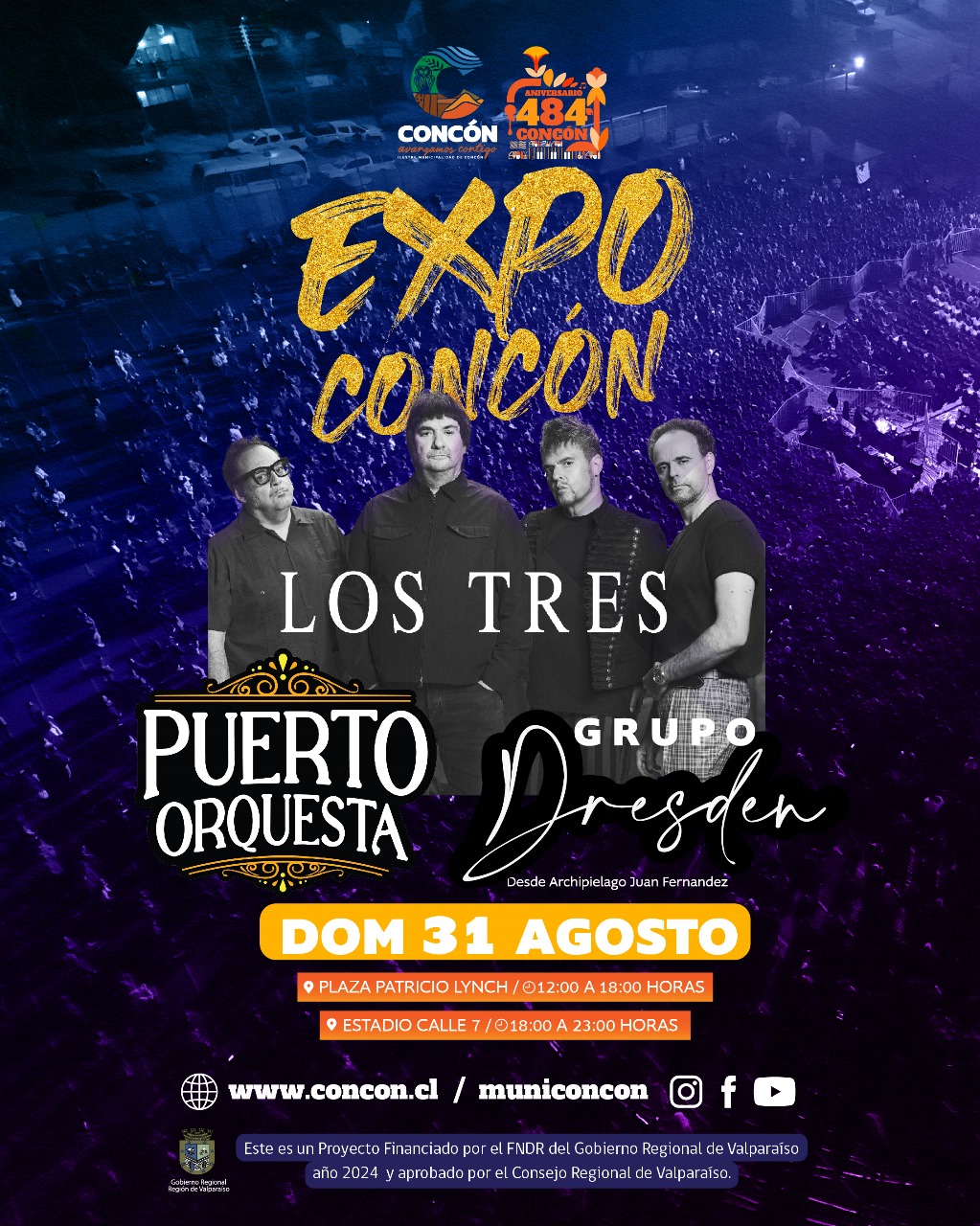 Mientras que el día domingo 31 de agosto, será el turno de La Puerto Orquesta, Grupo Dresden y el esperado cierre de Los Tres, con todos sus éxitos y formación original.