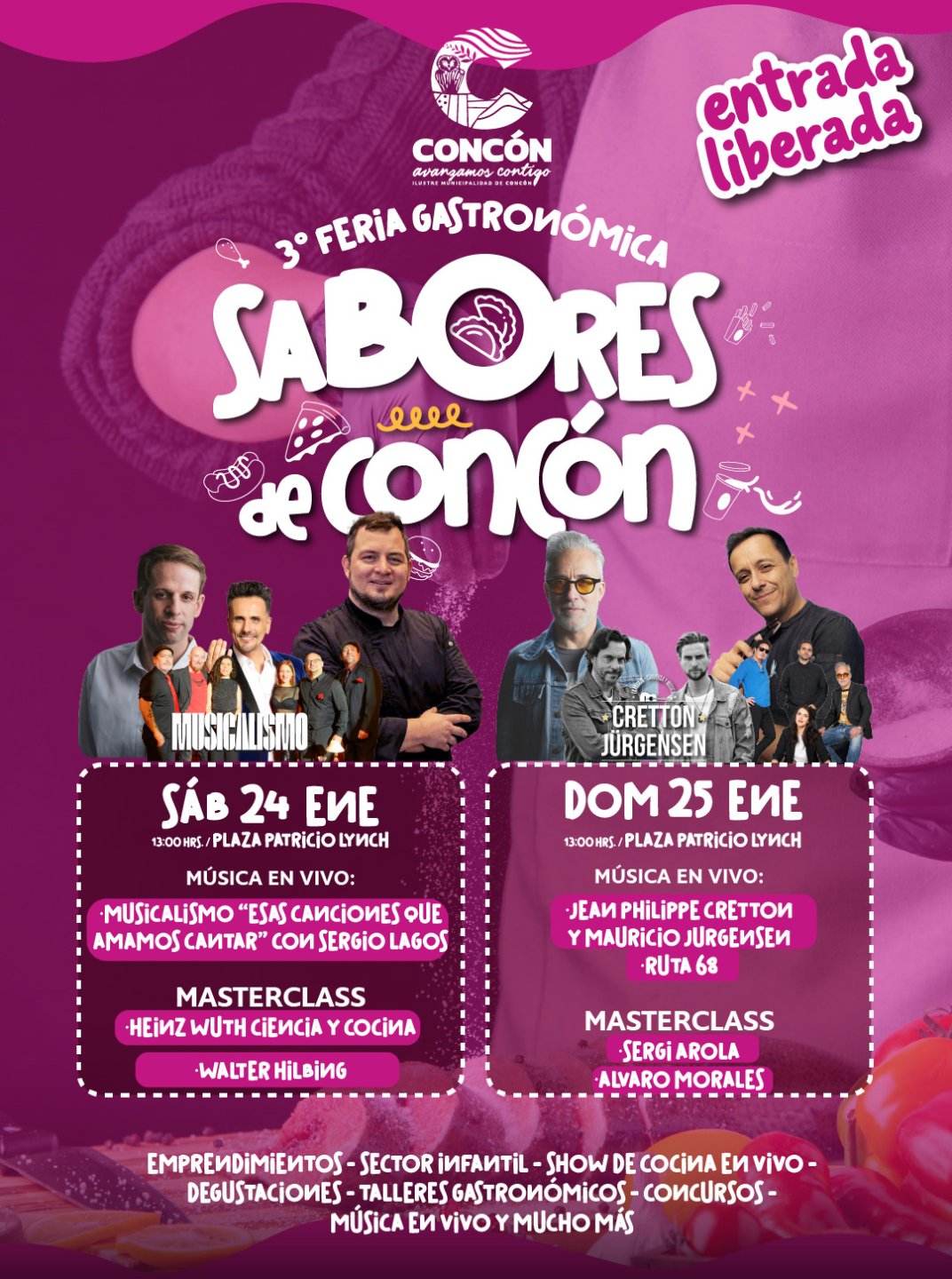 En la plaza Patricio Lynch y con diversos expositores, este sábado 24 y domingo 25 de enero se realizará la III Feria Gastronómica «Sabores de Concón», espacio que tendrá un escenario con música y preparaciones en vivo de distintos chefs de renombre, en una actividad completamente gratuita y abierta a la comunidad.
