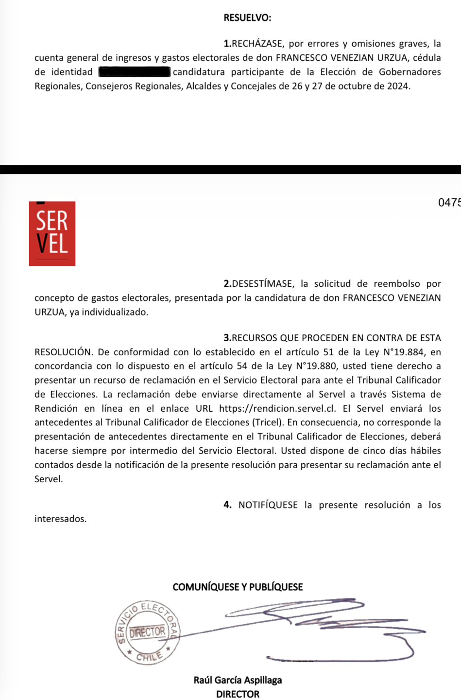 "Recházase, por errores y omisiones graves, la cuenta general de ingresos y gastos electorales de don Francesco Venezian Urzúa (...) candidatura participante de la Elección de Gobernadores Regionales, Consejeros Regionales, Alcaldes y Concejales de octubre de 2024", sostuvo el Servel en la resolución a la que accedió Puranoticia.cl.