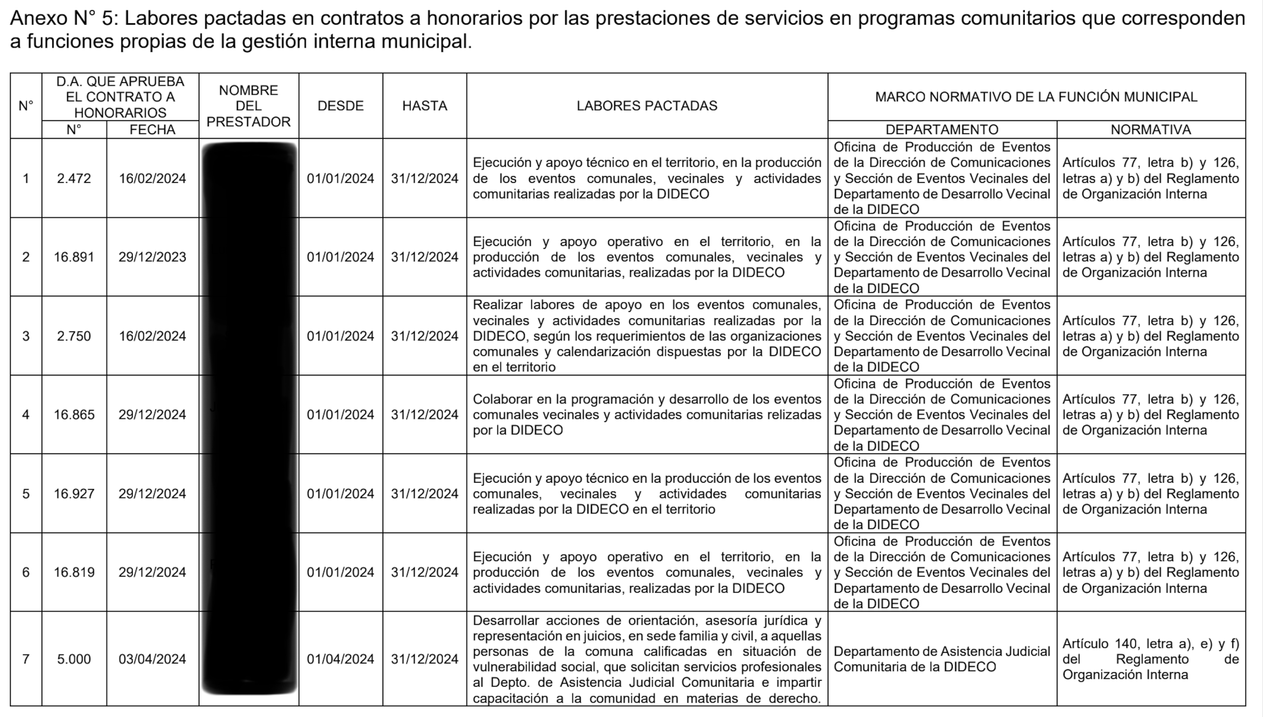 También se menciona una contratación a honorarios en programas comunitarios para el desarrollo de labores propias de la gestión interna del Municipio, por lo que deberán velar por el estricto cumplimiento de los dictámenes que dispone que la procedencia de estas contrataciones está supeditada a que las funciones se encuentren debidamente acotadas al desarrollo de actividades específicas del respectivo programa.