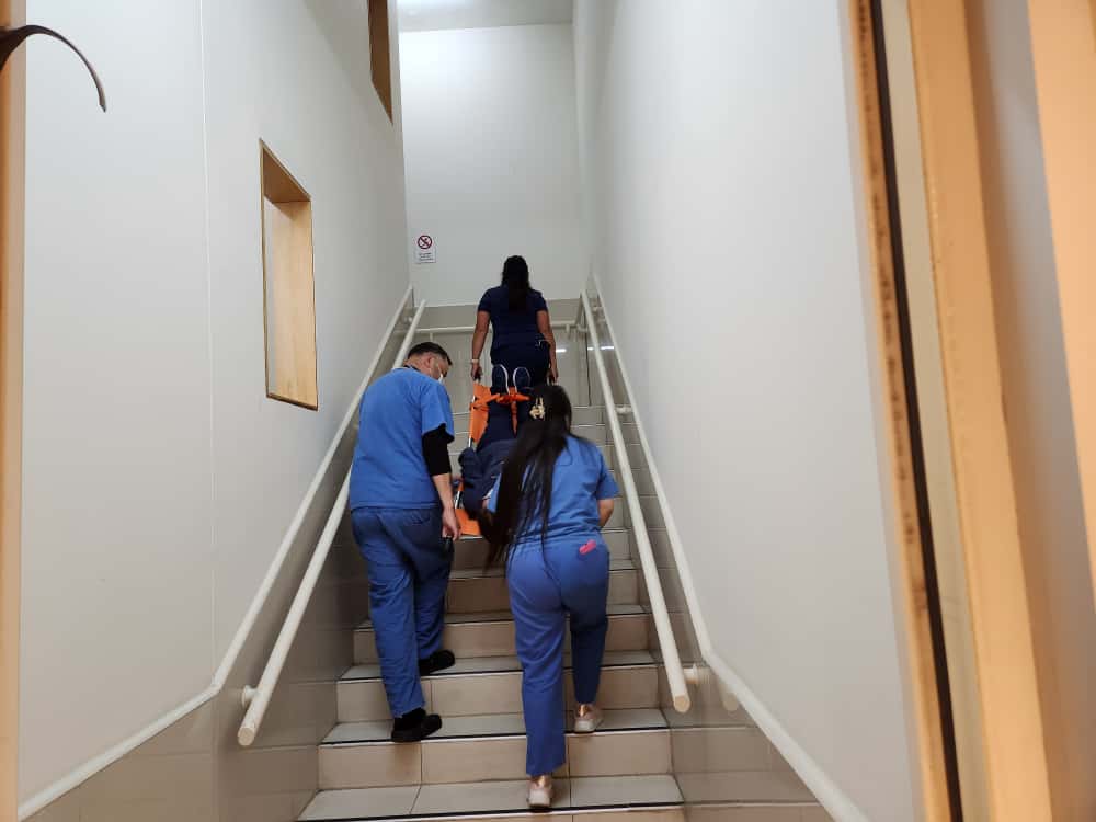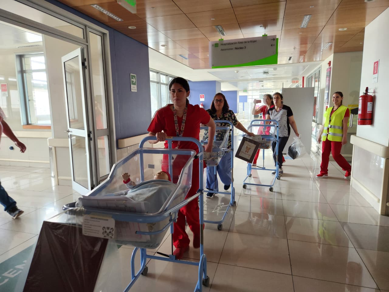 Las unidades de Emergencia Adulto, Infantil y de Alto Riesgo Obstétrico desalojaron a algunos pacientes que con camillas subieron por las escaleras hasta el piso siguiente; ello mientras el nivel 2, de hospitalizaciones complejas, compuesto por la Unidad de Paciente Crítico Pediátrico, Adulto y Cardiovascular, abandonaban también su ubicación hasta un área segura por un amago de incendio. Los pisos superiores por su parte, se sometieron al ejercicio de falla eléctrica, evacuando igualmente a puntos seguros del establecimiento.