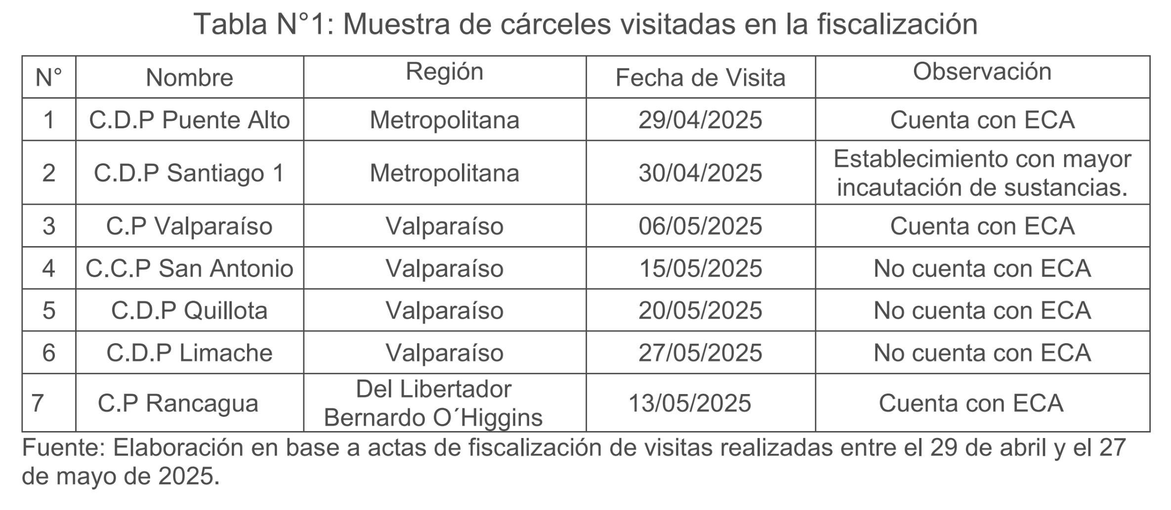 En lo que atañe exclusivamente a los establecimientos penitenciarios de la región de Valparaíso, la investigación de la entidad que fiscaliza a los órganos del Estado visitó el Complejo Penitenciario de Valparaíso, el Centro de Cumplimiento Penitenciario de San Antonio, el Centro de Detención Preventiva de Quillota y el Centro de Detención Preventiva de Limache, entre el 29 de abril y el 27 de mayo del año en curso.
