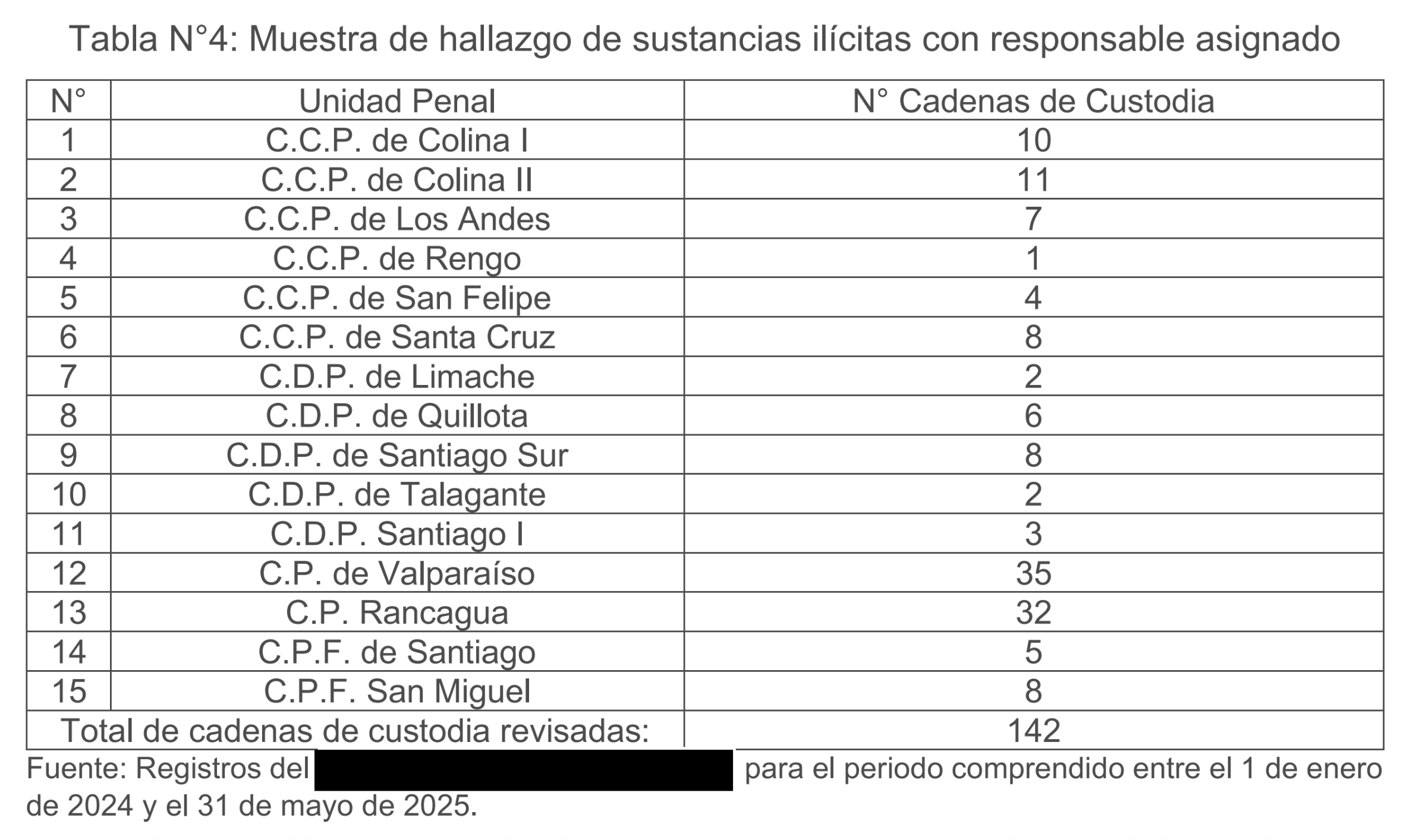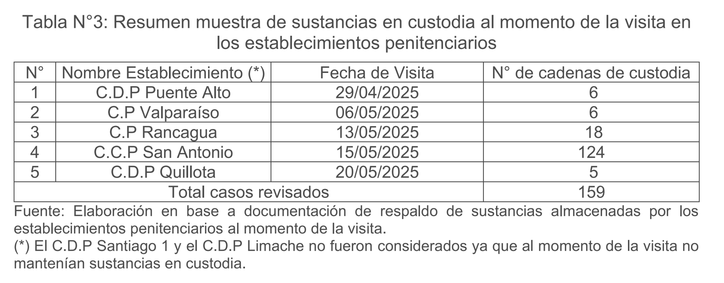 De igual forma, se realizó una revisión de la documentación de respaldo del 100% de las sustancias que se encontraban almacenadas en los establecimientos penitenciarios al momento de la visita, lo que ascendió a 159 formularios de cadenas de custodia. Las muestras en custodia al momento de la visita de Contraloría da cuenta que en la cárcel de Valparaíso había 6 cadenas de custodia, en San Antonio 124 y en Quillota 5.