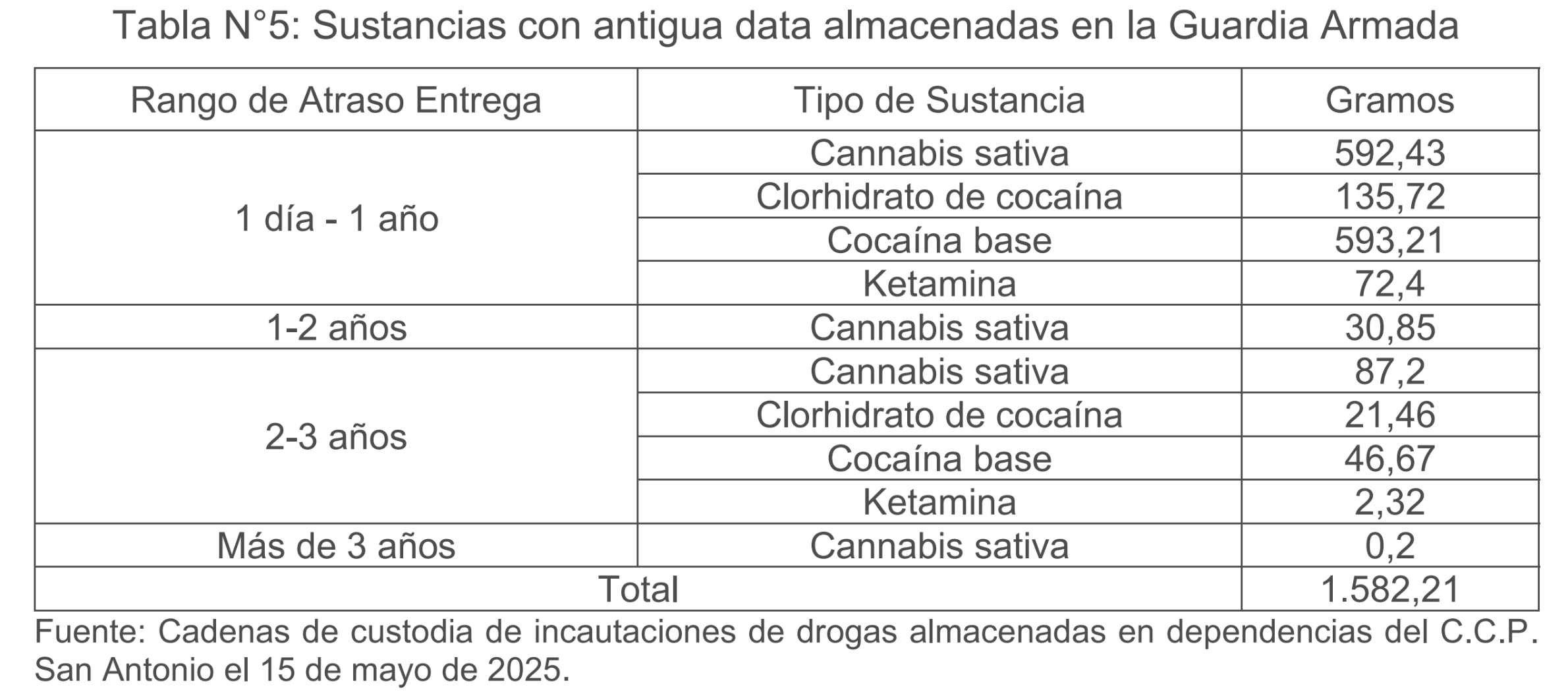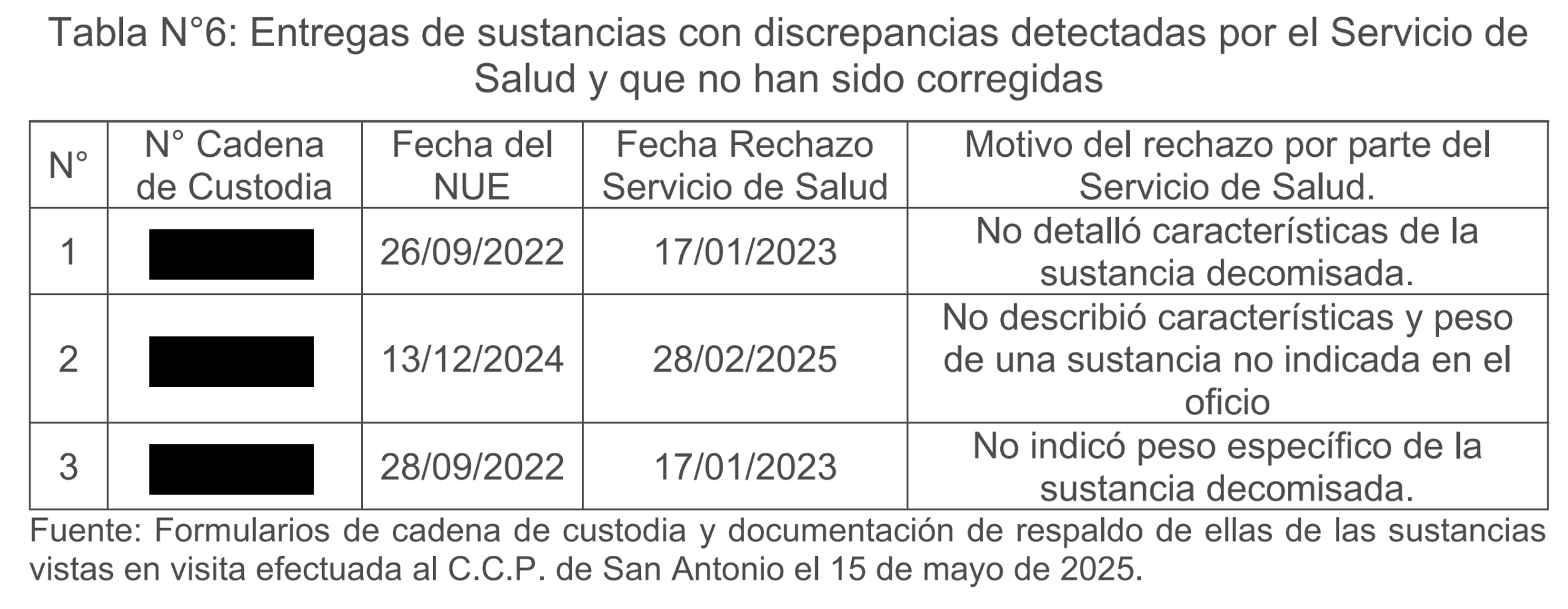 También se observó que en el CCP de San Antonio, 124 cadenas de custodia con sustancias ilícitas incautadas no fueron entregadas al Servicio de Salud en el plazo legal, evidenciándose casos con más de tres años de almacenamiento.