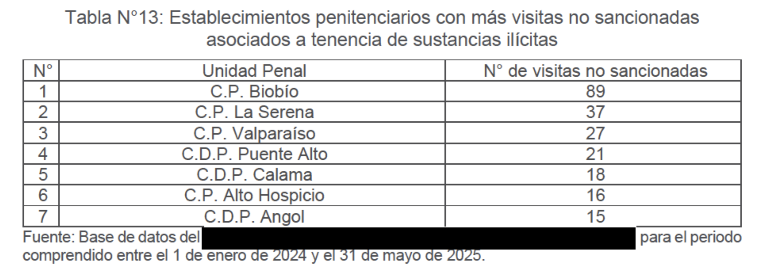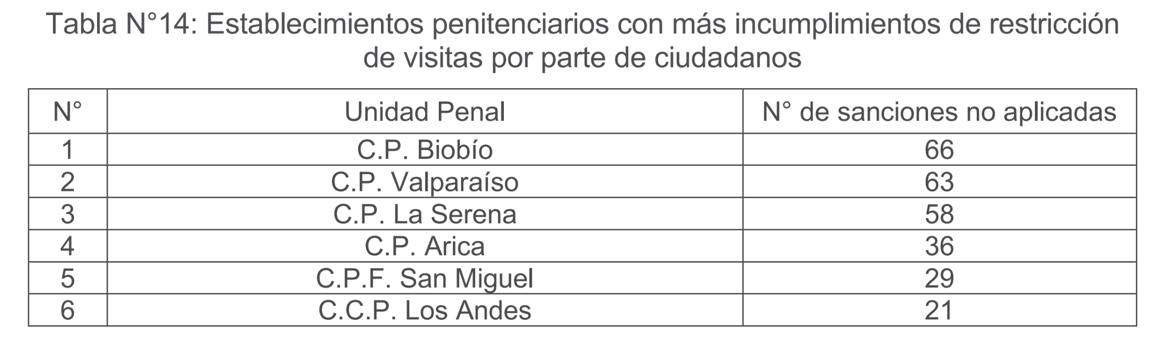 Finalmente, se detectó que 397 visitantes ingresaron a cárceles de nuestro país a pesar de tener prohibición para ello. De esta cifra, 63 sanciones no aplicadas corresponden a la cárcel de Valparaíso, mientras que 21 obedecen a la cárcel de Los Andes.