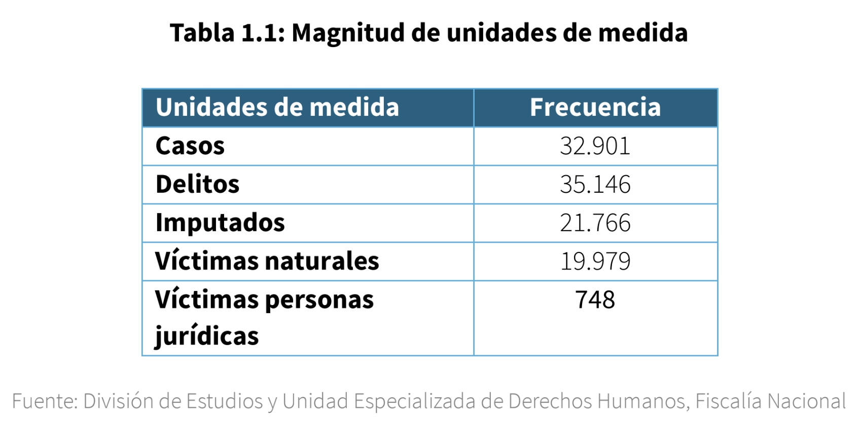 El detalle muestra que entre el 18 de octubre de 2019 y el 31 de marzo de 2020, ingresaron al Ministerio Público 32.901 casos, con 35.146 delitos, los que involucraron a 20.727 víctimas, de las que 19.979 correspondieron a personas (víctimas naturales) y 748 a empresas e instituciones (víctimas jurídicas). Asimismo, se registraron 21.766 imputados conocidos en el ingreso de la denuncia.