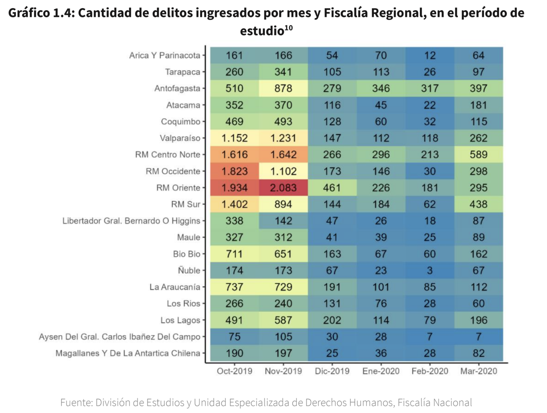 Como concluye la Fiscalía Nacional en su «Informe Estadístico del Estallido Social», conforme a los datos y antecedentes presentados, el sistema se vio enfrentado no solo a un alto volumen de causas en un corto periodo de tiempo, sino que también a delitos de mayor gravedad y que atentan contra bienes jurídicos relevantes, lo que generó la necesidad de que la institución tuviera que adaptar rápidamente sus prácticas cotidianas de persecución penal y, por tanto, su operación, a fin de abordar adecuadamente los distintos fenómenos delictivos puestos en conocimiento del órgano persecutor.