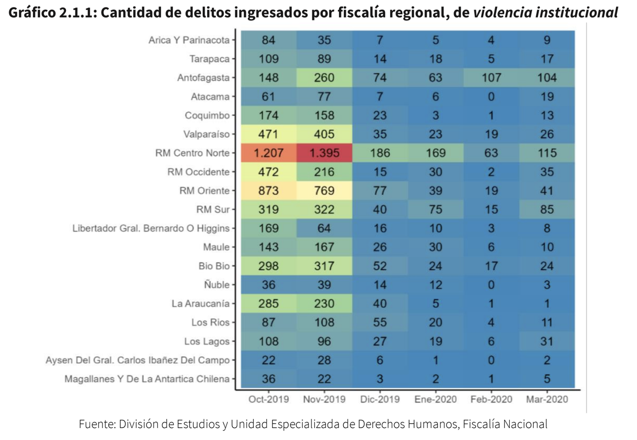 En materia de delitos de violencia institucional, los cuales corresponden a denuncias por delitos cometidos por agentes del Estado contra personas particulares, se observa que entre octubre y noviembre de 2019, hasta la Fiscalía Regional de Valparaíso ingresaron 471 y 405 casos, respectivamente, los que bajaron conforme pasaban los meses, con 35 en diciembre, 23 en enero de 2020, 19 en febrero y 26 en marzo.
