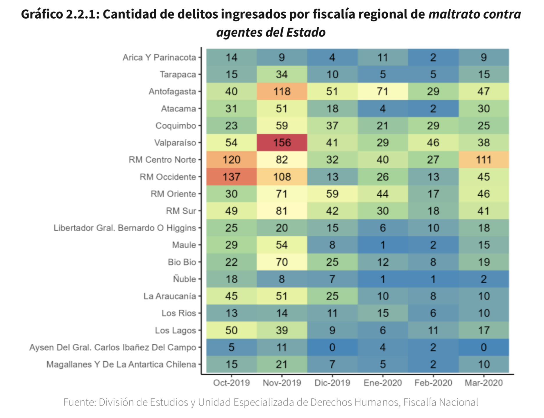 Respecto al ingreso nacional en el periodo comprendido entre octubre de 2019 y marzo de 2020, la mayor cantidad se concentró en la región de Valparaíso, con 156 denuncias en noviembre de 2019. En octubre, en tanto, hubo 54 denuncias; mientras que en diciembre bajaron a 41. En enero de 2020, hubo 29 denuncias por maltrato contra agentes del Estado; en febrero 46 y finalmente en marzo 38 denuncias.