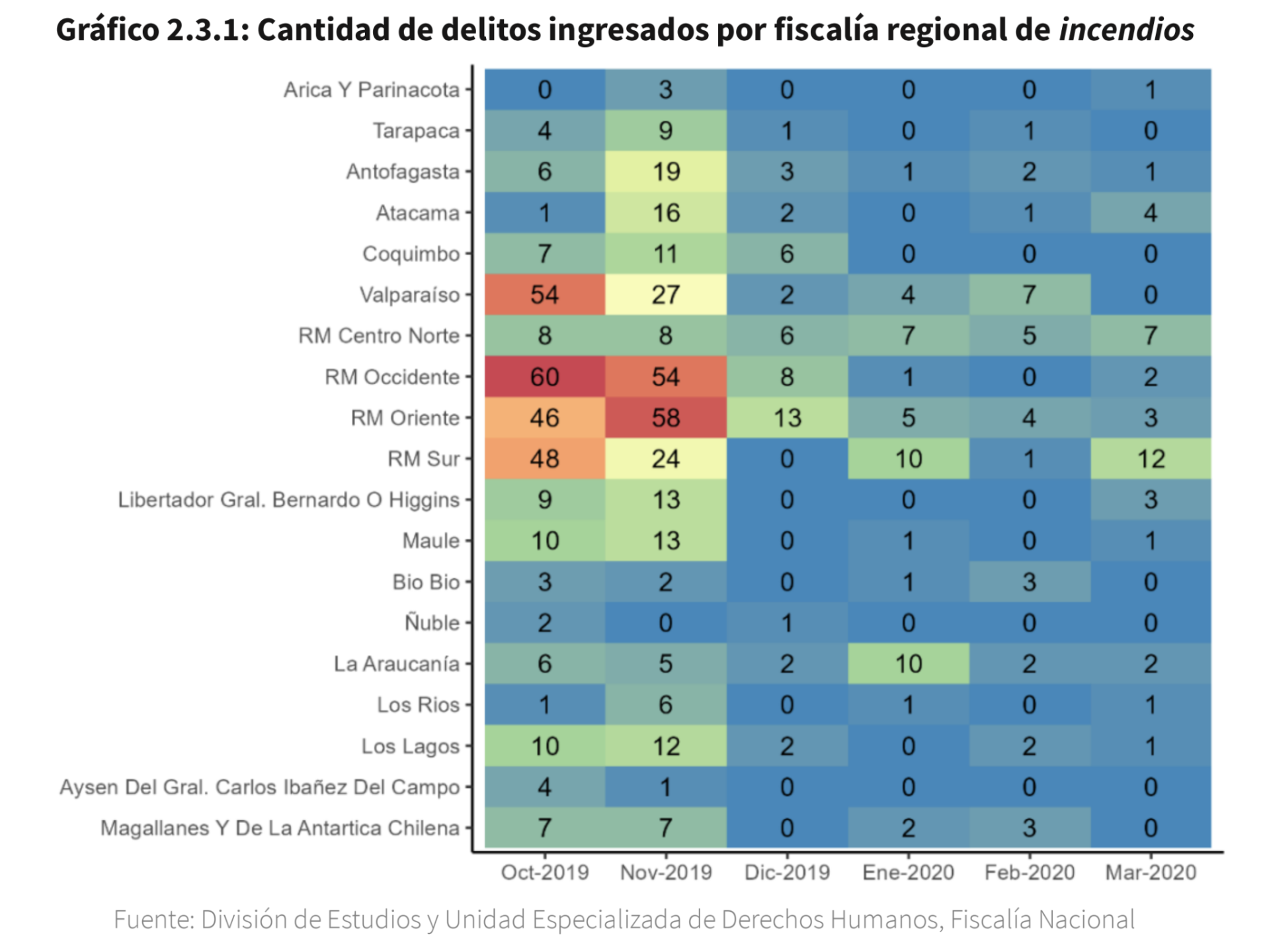 El estudio elaborado por la Fiscalía Nacional muestra que en la región de Valparaíso se registraron 54 delitos de incendios ingresados a la Fiscalía Regional durante octubre de 2019, los cuales pasaron a 27 durante noviembre y a sólo 2 en diciembre. Ya en el año 2020, se reportaron un total de 4 ingresos en enero, 7 en febrero y 0 en marzo.