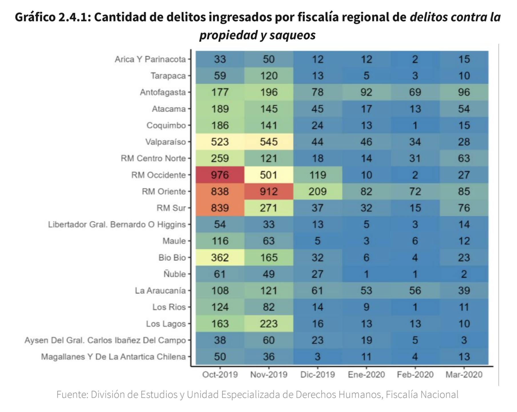 En el caso de la región de Valparaíso, se reportaron 523 ingresos asociados a delitos contra la propiedad y saqueos en octubre de 2019, cifra que aumentó a 545 en noviembre, pero que descendió a 44 durante el mes diciembre. Ya durante el año 2020, la Fiscalía Regional reportó 46 ingresos en enero, 34 en febrero y 28 durante marzo.
