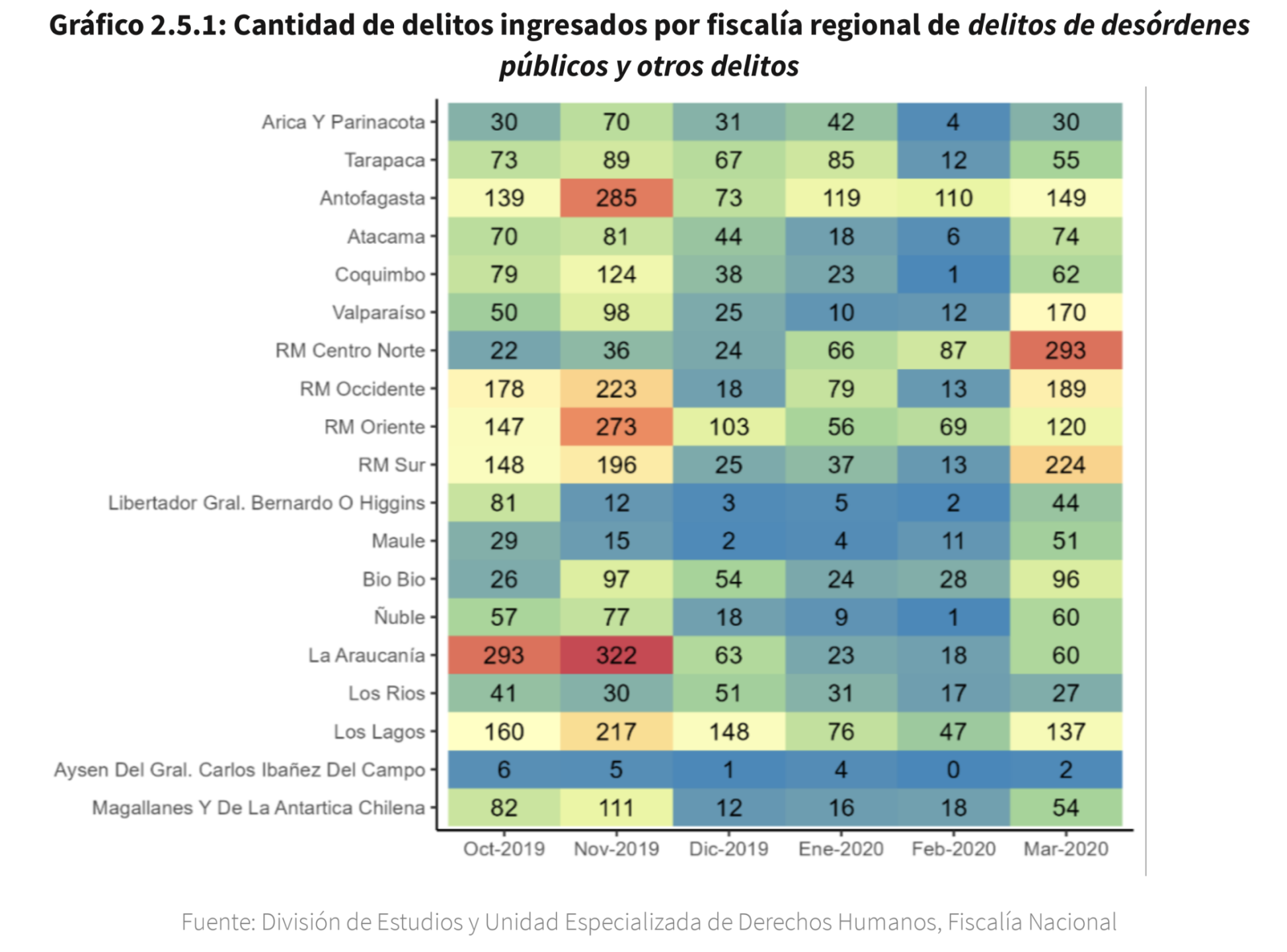 Las cifras del informe muestran que en la región de Valparaíso se ingresaron 50 casos de delitos de desórdenes públicos durante octubre de 2019, los que aumentaron a 98 durante noviembre y bajaron a 25 en diciembre. 10 fueron los cometidos en enero de 2020, 12 en febrero, y finalmente un importante ascenso a 170 en marzo.