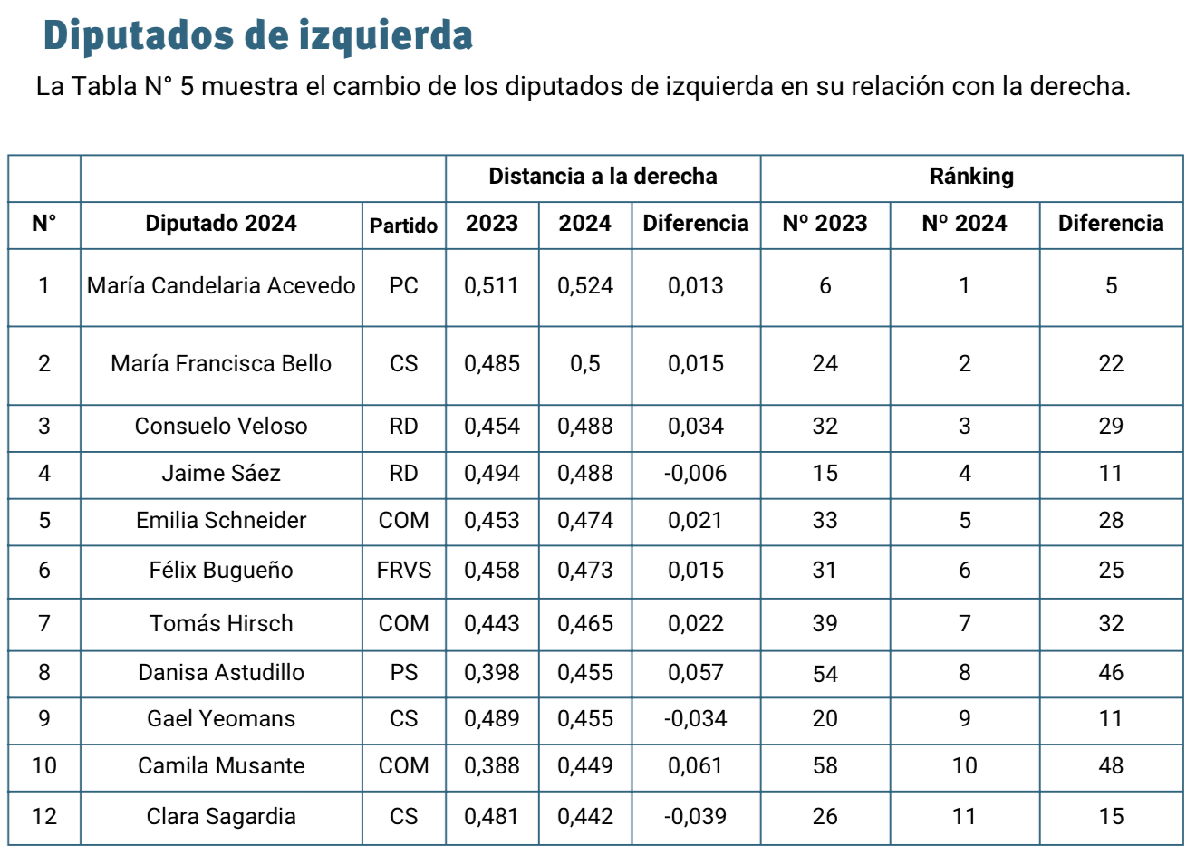 De los 79 diputados de izquierda, aquellos que tuvieron el mayor cambio en el ranking, alejándose de la derecha, siendo el 1° el más lejano de la derecha y el 79° el más cercano, la diputada Camila Musante pasó de estar en el puesto 58° en 2023 al 10° en 2024, moviéndose 48 puestos. Le siguen Danisa Astudillo (PS) con un movimiento de 46 puestos, pasando del 54° en 2023 al puesto 8° en 2024 y Pamela Jiles (PH), quien se alejó 46 puestos de la derecha en 2024, pasando del 74°al 28°.
