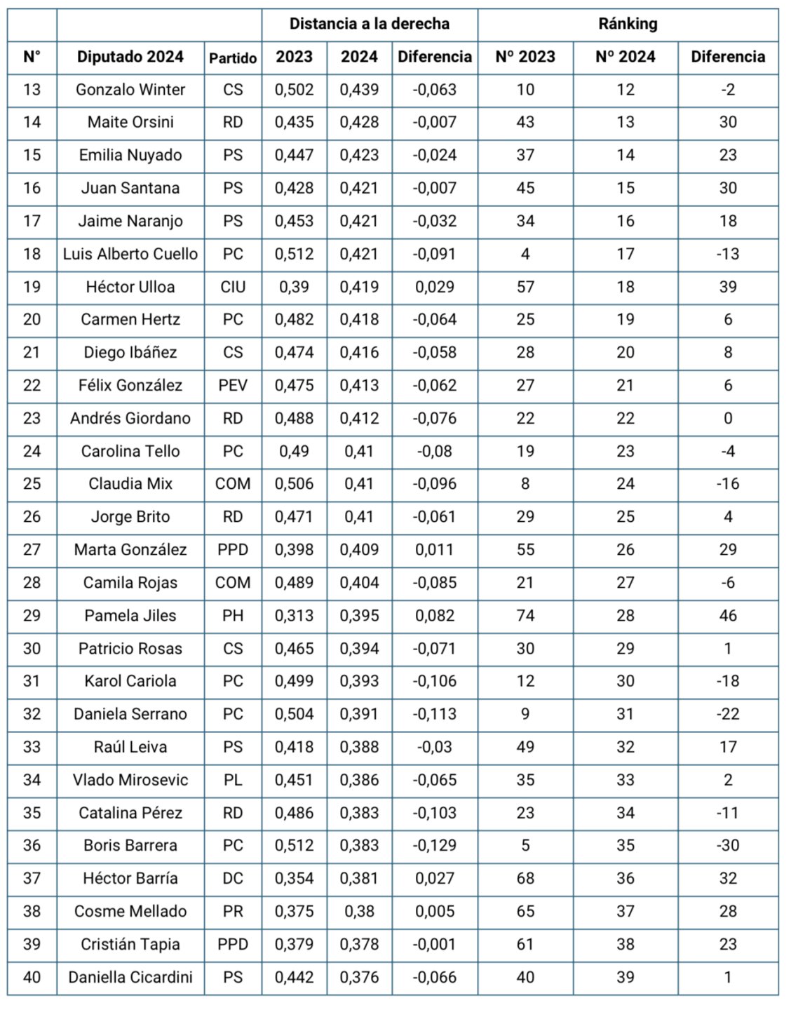 Dentro de la derecha, los diputados que experimentaron un cambio más significativo, acercándose a la izquierda, siendo el 1° el más alejado de la izquierda y el 75° el más cercano, están liderados por Gustavo Benavente (UDI), pasando del puesto 13° en 2023 al 58° en 2024, junto con el presidente de la UDI, Guillermo Ramírez, quien pasó del puesto 14° en 2023, al 59°, moviéndose ambos diputados 45 puestos hacia la izquierda. Más atrás aparece sorprendentemente la diputada por Valparaíso Camila Flores (RN), quien se movió 40 puestos, pasando del puesto 28° en 2023 al 68° en 2024.