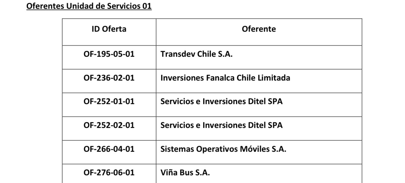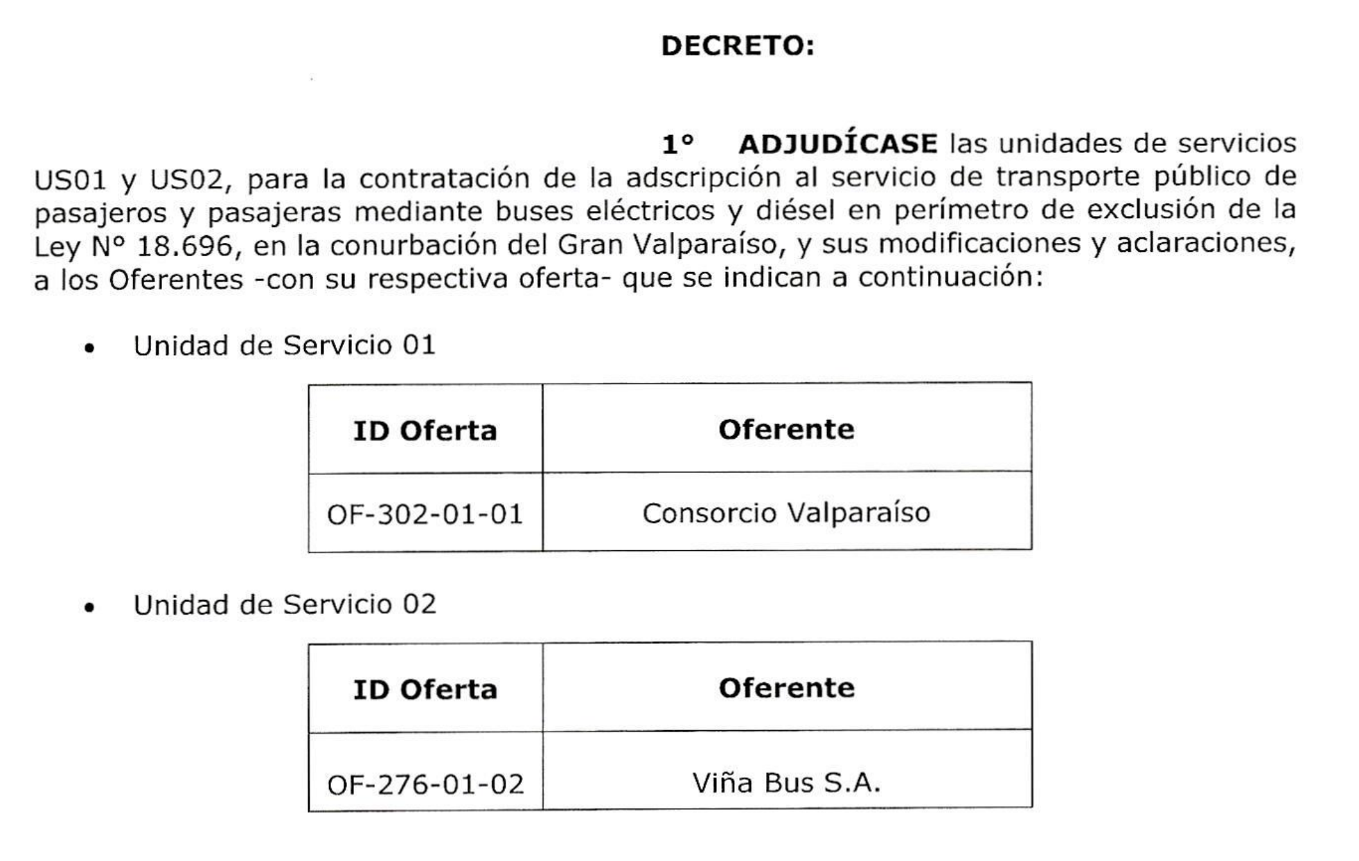 Importante es recordar que el objeto de la licitación era proveer de servicios de transporte al Gran Valparaíso, mediante la contratación de las Unidades de Servicios (US) 01 y 02, para la adscripción al servicio de transporte público urbano, con buses eléctricos y diésel, en el Perímetro de Exclusión de las cinco comunas de la conurbación.