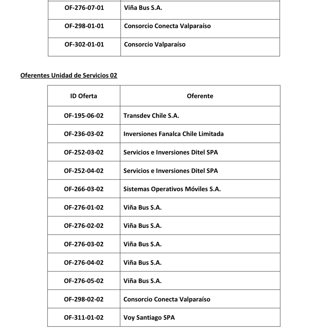 Luego de la evaluación económica, la comisión determinó las ofertas que correspondiera adjudicar, de acuerdo con el puntaje económico obtenido de cada oferta. Así es como en función de los puntajes económicos indicados, para la Unidad de Servicios 01 propuso que la oferta se adjudique a Consorcio Valparaíso, mientras que para el caso de la Unidad de Servicios 02 se propuso adjudicar la oferta de Viña Bus S.A..