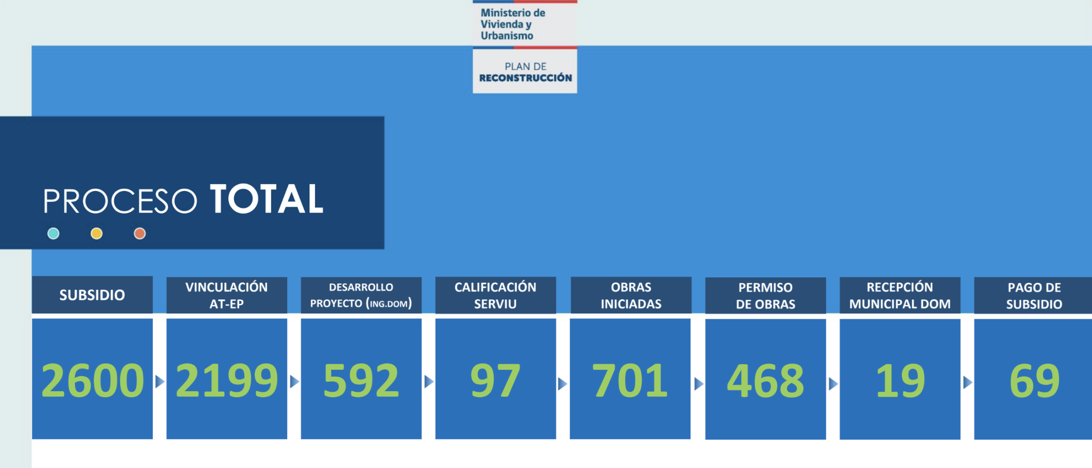 En cuanto al proceso de reconstrucción, el informe del Ministerio de Vivienda al que accedió Puranoticia.cl reporta un total de 701 con obras iniciadas, 2.600 subsidios, 2.199 con vinculación entre Asistencia Técnica (AT) y Entidades Patrocinantes (EP), 592 con desarrollo de proyecto, 97 con calificación del Serviu, 48 con permiso de obras, 19 con recepción en la Dirección de Obras Municipales (DOM) y 69 con pago de subsidio.
