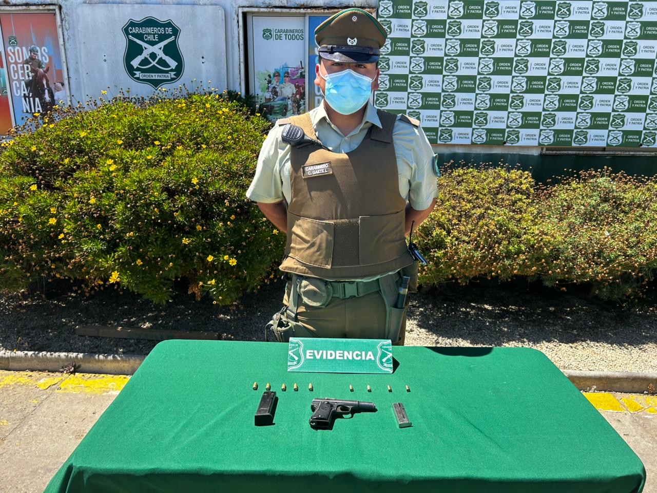 Tras un seguimiento, los funcionarios lograron darle alcance y detenerlo. En medio de la huida, el individuo dejó caer al suelo un arma de fuego tipo pistola, la que mantenía su cargador y cuatro municiones en su interior.