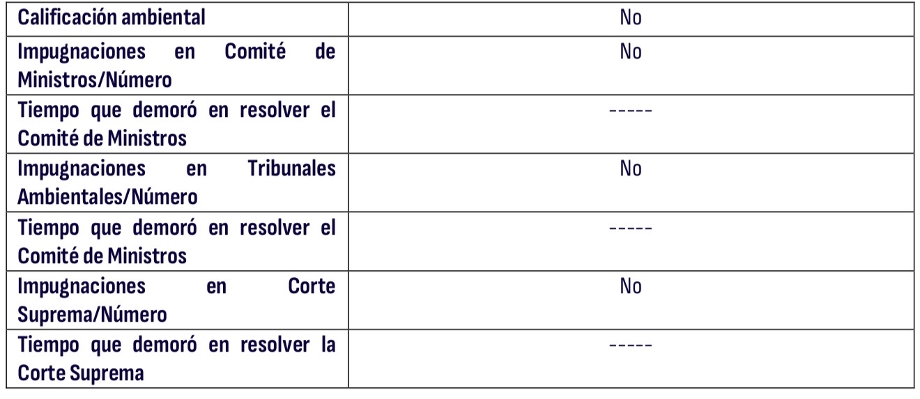 Además, el estudio de Piensa y Pivotes da cuenta que el proyecto obtuvo RCA favorable el 11 de noviembre del 2020, pero fue objeto de un recurso de protección en la Corte de Apelaciones de Valparaíso, retrotrayéndose el proceso de la DIA al momento previo a su calificación, debiendo someterse previamente a participación ciudadana. Nuevamente se calificó favorablemente el 13 de mayo de 2021, pero se solicitó su invalidación. Tras el rechazo de la invalidación, se reclamó ante el 2º Tribunal Ambiental, que en octubre de 2025 confirmó la validez de la RCA. Pero la sentencia fue objeto de varios recursos de casación en el fondo y en la forma, los cuales están pendientes de resolución.